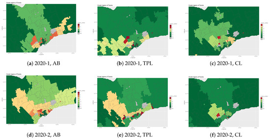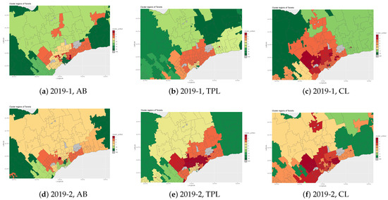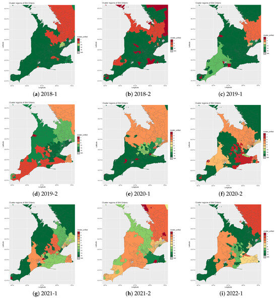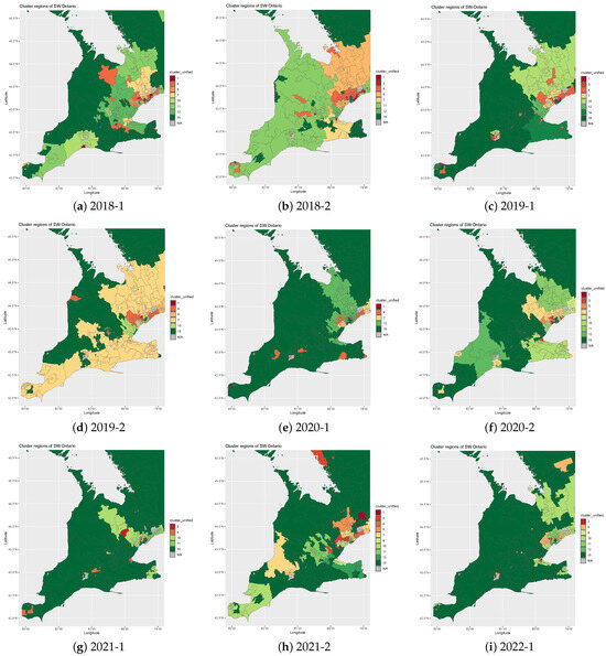 Upon examining these spatial clustering results, several interesting dynamics emerge. Firstly, there appears to be a high degree of reduction in claim severity, particularly evident beyond the Greater Toronto Area. This reduction suggests potential shifts in driving behaviors, regional infrastructure changes, or other underlying factors warranting further investigation. Moreover, the observed reduction in loss cost during the COVID-19 pandemic receives further validation through the spatial clustering analysis depicted in Figure 3. This provides some statistical evidence for the broader trend of decreased vehicular activity and subsequent impact on insurance claims and associated loss costs during periods of restricted mobility. In essence, these findings underscore the utility of unified spatial clustering techniques in uncovering meaningful insights from temporal datasets. They not only highlight the dynamic nature of risk profiles within southern Ontario but also emphasize the importance of adaptive methodologies in understanding spatial loss patterns over time.