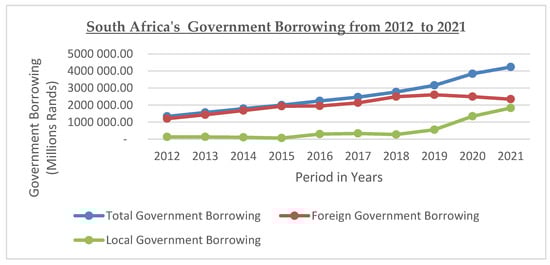 In this paper, total government borrowing (TGB), local government borrowing (LGB), and foreign government borrowing (FGB) were utilised to measure GB. As a result, Figure 1 examines the trends in South Africa’s average government borrowings from 2012 to 2021.