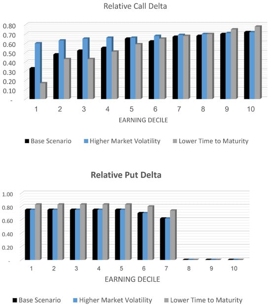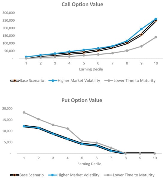 In a robustness check, in the color blue in both figures, when increasing the market sigma from 20% to 35% per year, naturally the Call option’s value increases following the Black–Scholes option pricing model and consequently its relative delta. This increase is mainly shown among the lower-earning deciles as the Call option value converged to its maximum value in deciles 9 and 10. Naturally, the Put option, which is not connected to the market but to the GDP per capita, is not affected. We conclude that in a riskier market, there is a higher tendency to a funded pension scheme. This phenomenon was validated by ().