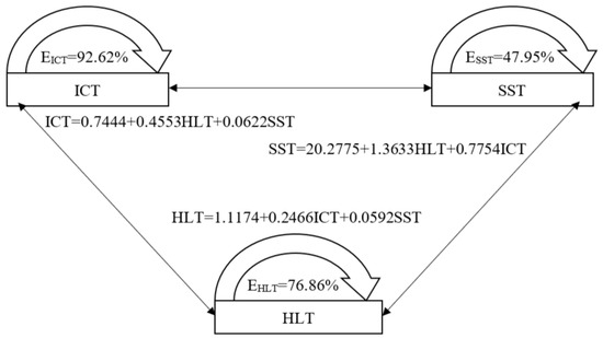 Empirical data are provided in Table A1. To reflect the systemic relationship between ICT implementation, support for sustainable development, and financial risks in healthcare, the author performed modeling using the structural equation modeling (SEM) method. First, the author conducted a regression analysis of the dependence of each variable on the other two variables. Then, the regression equations (showing the interdependencies of the indicators) are supplemented with variation coefficients (showing the model errors) and combined into a general SEM model. The research model is presented in Figure 1.