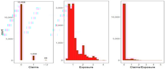 The dataset is originated from cars driven in the US, where special UBI sensors were installed. The University of Haifa Actuarial Research Center provided the data, where UBI modelling was analysed (). It contains two column vectors of claim frequencies and policy duration or exposure in a year. Ninety-two percent of are zero. Figure 1 displays three histograms for , , and annual claim frequencies (), respectively. The dataset also contains numerical DVs constructed based on the information collected from telematics and GPS for 14,157 drivers. Figure A2 in Appendix D.1 visualises the DVs by plotting across driver i, with colours indicating the number of claims . We remark that the DVs are labelled up to 77 with some skips of numbers. For example, DV 6, 11, 12, etc. do not exist in Figure A2. Each DV describing a specific event (details in the next section) has been aggregated over time to obtain certain incidence rates (per km or hour of driving) and scaled to normalise their ranges for better interpretability of their coefficients in the predictive models. These procedures transformed the multidimensional longitudinal DVs into a single row for each driver, which is the unit of analysis. All DVs are presented as column vectors .