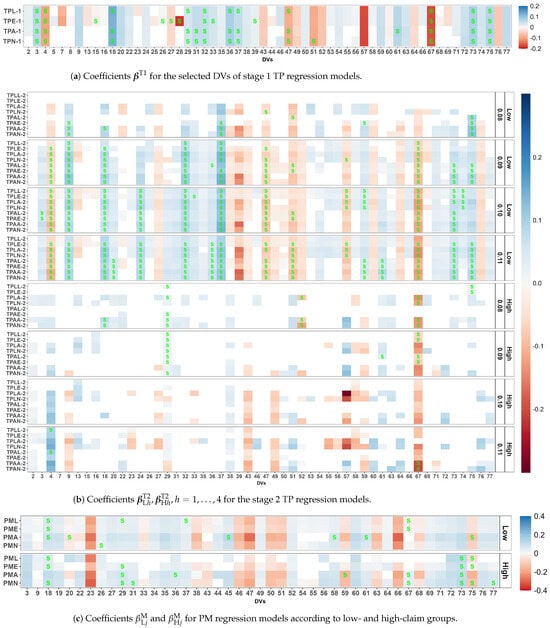 where T2 indicates stage-2 of the TP model. Then, regularised Poisson regression was applied to each and . Let the index sets and for nonzero coefficients (that is, selected at least once from ) be defined similar to in (A2) for . Then, and are averaged parameter estimates for the low- and high-claim groups, respectively, obtained in a similar manner to defined in (A1), and and are importance measures based on the and defined similarly to in (A3); and are the number of frequently selected DVs out of and , with > 43 (; for and is the lower threshold of ), 49 (), 53 (), 56 (), 19 (), 13, 9, and 6, respectively, (and dropped otherwise). Poisson regression models with various selected DVs were refitted to the low- and high-claim groups for each h. Table A3 in Appendix E reports the parameter estimates of the best model (TPLA-2 for and TPLN-2 for ) when the stage 1 model was TPL-1 (from selected DVs) or TPA-1 (). Table 3b reports the number of selected and and the number of significant and with p values < 0.05.