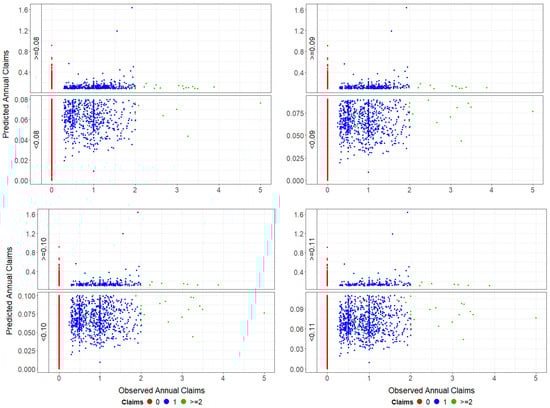 Scatter plots of observed annual claim frequencies against predicted annual claim frequencies using TPA-1 model cross-classified with low- and high-claim groups by the four thresholds, with colour indicating claims .