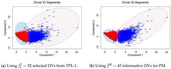 We compared the performance of the TP and PM models in terms of claim prediction, predictive DVs selection, and driver classification. Table 3b displays the performance of all 32 TP models and four PM models. The best TP model for each threshold and the best PM model were selected according to in (10) using four measures. Among the selected TPLA-2 (), TPLN-2 (), and PMA models, Table 3c shows that the PMA model succeeded through the final selection using six count model scores, confirming the superiority of PM model in many aspects and its preferability over the Poisson model. For an interpretation of the significant selected DVs (29, 36, 59, 67, 73; all with positive coefficients except 59) using the PMA model, risky driving is associated with more frequent severe brake to slow-down at weekday and weekend nights, as well as more frequent severe right turns at the junction at weekday nights and Friday rush time.