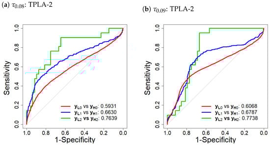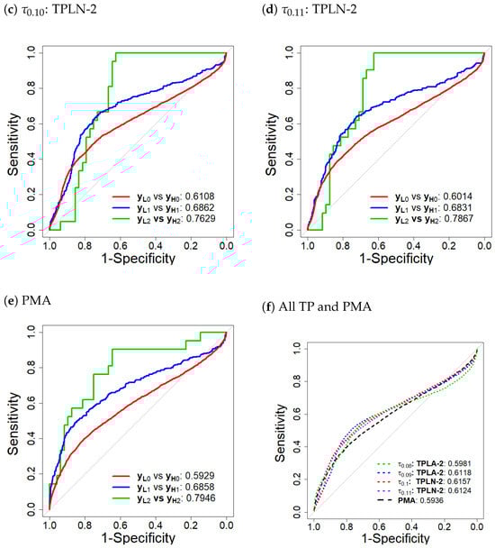 For model selection, Table 3b summarises the model performance measures, BIC, MSE, , and AUC (see Section 2.3) using all data for 32 models, with 8 models under each threshold. The two criteria, BIC and AUC, in Table 3b were averaged over the two groups using the ratio in Table A3. For each threshold, top ranked measures and the sum of rank in (10) are boldfaced and yellow highlighted. We first dropped those models with for either group and chose the best model with the top . The best stage two model is TPLA-2 for and TPLN-2 for . The results will be compared for the PM and ZIP models in Section 3.7.