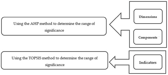 According to the final goal of the research, which is to provide a financial stability model for Iraqi companies, experts’ opinions should be analyzed to determine the statistical significance of the coefficient of each model’s dimensions, components, and indicators. The hierarchical analysis process method will be used to analyze dimensions and components, and the TOPSIS method will be used to analyze indicators. The reason for using the TOPSIS method in the analysis of indicators is that the number of indicators exceeds the limit of other applicable methods, such as AHP. The AHP is a structured technique to organize and analyze a complex decision based on qualitative and quantitative factors. It involves breaking down a decision into a hierarchy of objectives, criteria, and alternatives. The TOPSIS approach, as a statistical technique, is used to provide the order of preference by similarity to the ideal solution in our multi-criteria decision analyses, which considers evaluation and ranking against multiple criteria. We employed the TOPSIS due to its simplicity and rationality. TOPSIS gives an apparent and rational view of how to make decisions; it is easy to understand and implement, increasing our findings’ credibility. It suggests a quantifiable process featured with flexibility for various kinds of data as necessary for our settings. It can accommodate a high number of criteria and alternatives, so it is suitable for the analysis of the complicated situation of this study. TOPSIS also provides a simple computational process that can easily be automated by the authors, thus enabling efficient analysis of the data sets used for this study. Therefore, the authors have used TOPSIS to ensure the credibility of the findings. In addition, employed method for determining model’s coefficient is displayed in Figure 3.