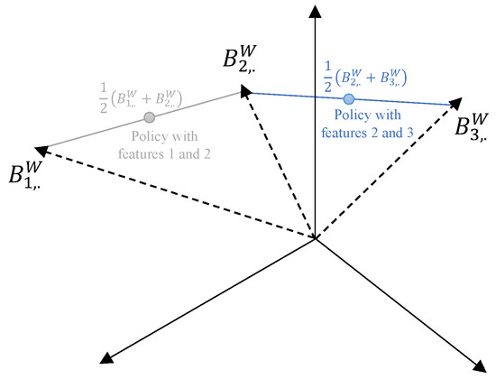 Since each modality b = 1 , , m is represented by its corresponding row r = 1 , , m in B W , that is, by a vector in R m , each policy can be projected in Burt space by taking the center of gravity D i , . B W / q of its modalities in D i , . , whose Burt coordinates are stored in the corresponding rows of B W . This is illustrated in Figure 1 in the case of three modalities.