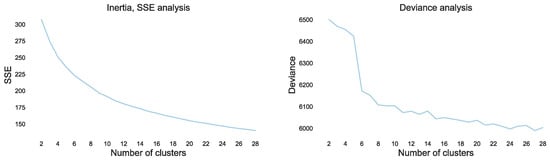 If we use the average motor claim frequency per cluster as a predictor, λ ^ i , we can estimate the goodness of fit of the partition with the Poisson deviance defined in Equation (10). The deviance is the difference between the saturated and partitioned model’s log-likelihood. If N i and ν i are, respectively, the number of claims and the duration (exposure) of the i-th contract, the deviance is defined as:
