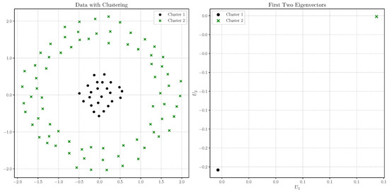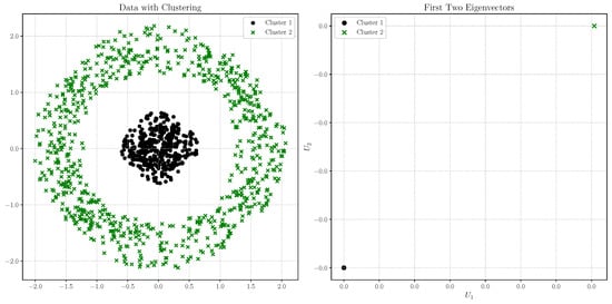 For this analysis, we construct a graph using the mutual k-nearest neighbors with k = 20 and set the similarity parameter to α = 1 . The left plot of Figure 12 clearly shows that spectral clustering effectively identifies the distinct inner and outer rings of the dataset. In the right plot, we present the coordinates of all pairs of eigenvectors, U i , 1 , U i , 2 i = 1 , , 1200 . Consistent with the above property, we observe in the right plot of Figure 12 that the eigenvector coordinates for points within the same cluster are identical (they are superimposed).