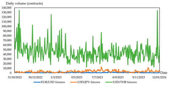 Daily trading volumes of EUR/USD futures, USD/JPY futures, and USD/THB futures from 31 October 2022 to 12 January 2024.