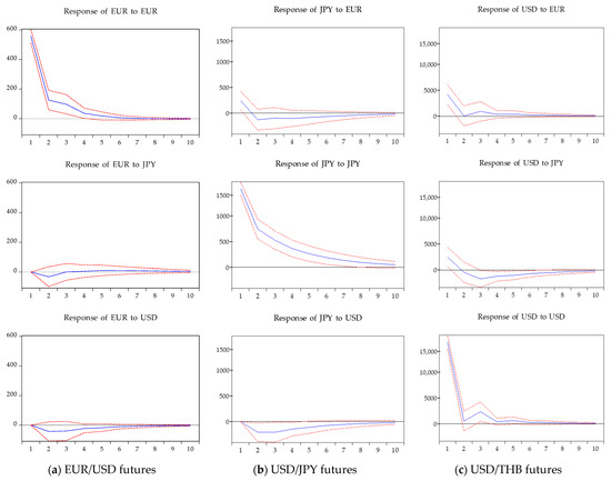 Next, the impulse response analysis is conducted to show the responses of the trading volumes of three types of FX futures, EUR/USD futures, USD/JPY futures, and USD/THB futures to a one-standard-deviation shock. As shown in Figure 3, for each case, the response to its own shock is positive and high on day 1. It diminishes quickly in the cases of EUR/USD futures and USD/THB futures trading volumes and reaches equilibrium within 6 days, while in the case of the USD/JPY futures trading volume, it exponentially decreases and reaches equilibrium after 10 days. The trading volumes of USD/JPY futures and USD/THB futures have no instantaneous impact on the EUR/USD futures trading volume. The negative response of the USD/JPY futures trading volume to the shock of the USD/THB futures trading volume can be detected within 2 days, and this effect disappears after day 10. The negative response of the USD/THB futures trading volume to the shock of the USD/JPY futures trading volume also vanishes after 10 days. Therefore, the results of the impulse response analysis match with the results of the Granger causality test and provide convincing evidence of the sign results of the VAR(2) model.