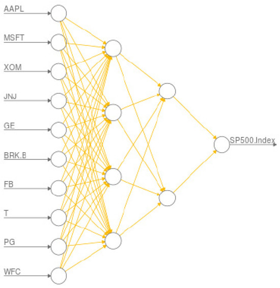 Figure 2 shows a deep learning network applied to the task of forecasting the S&P500 index. The inputs are the 10 largest stocks in the index and there are two hidden layers. Mathematically, the network is represented as follows: