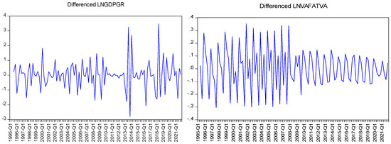 The stark contrast between GDPGR and VAFATVA highlights differences in economic dynamics and sectoral contributions. The stationary nature of GDPGR supports its use in dynamic models, while VAFATVA’s non-stationarity requires adjustments for trend and variability over time. These insights are critical for understanding economic performance and formulating financial and economic policies (Table 7).