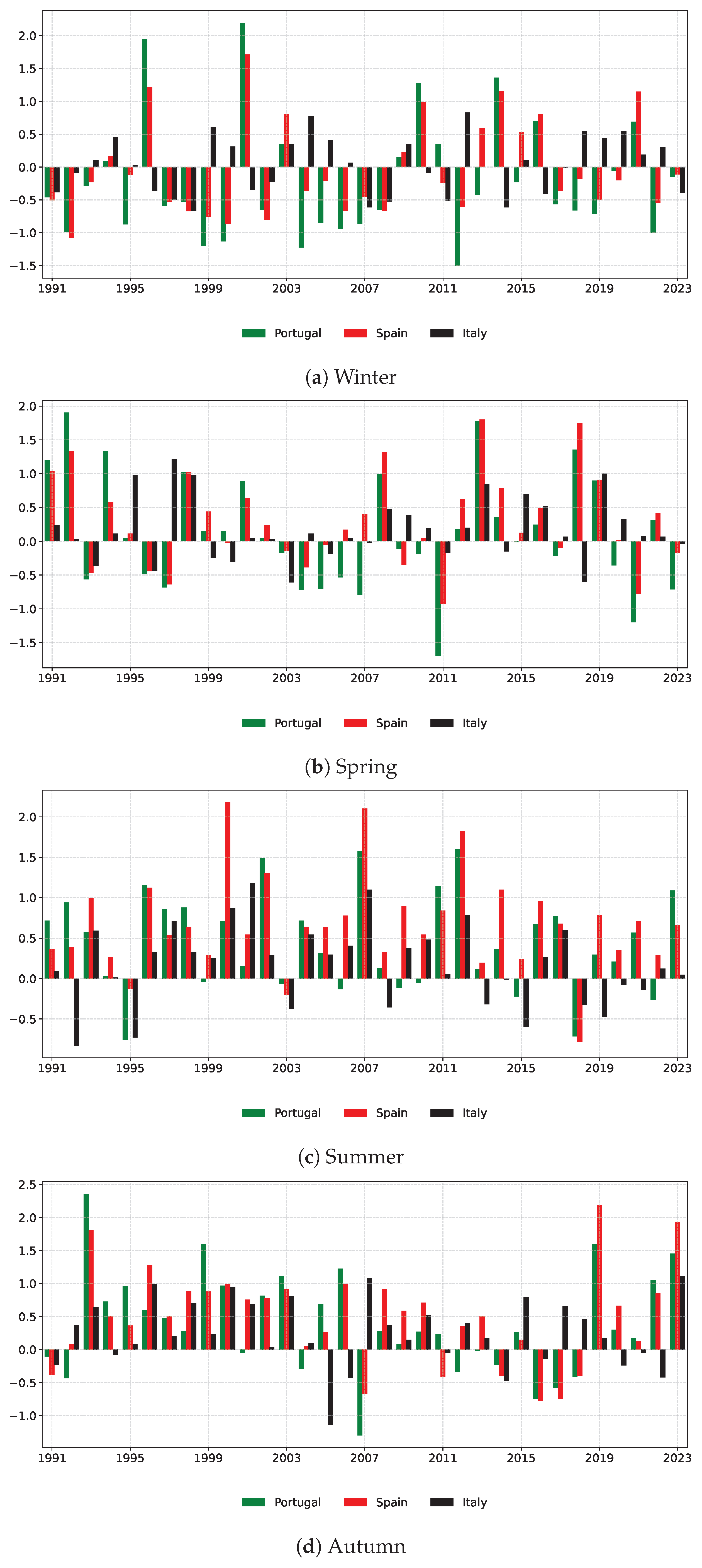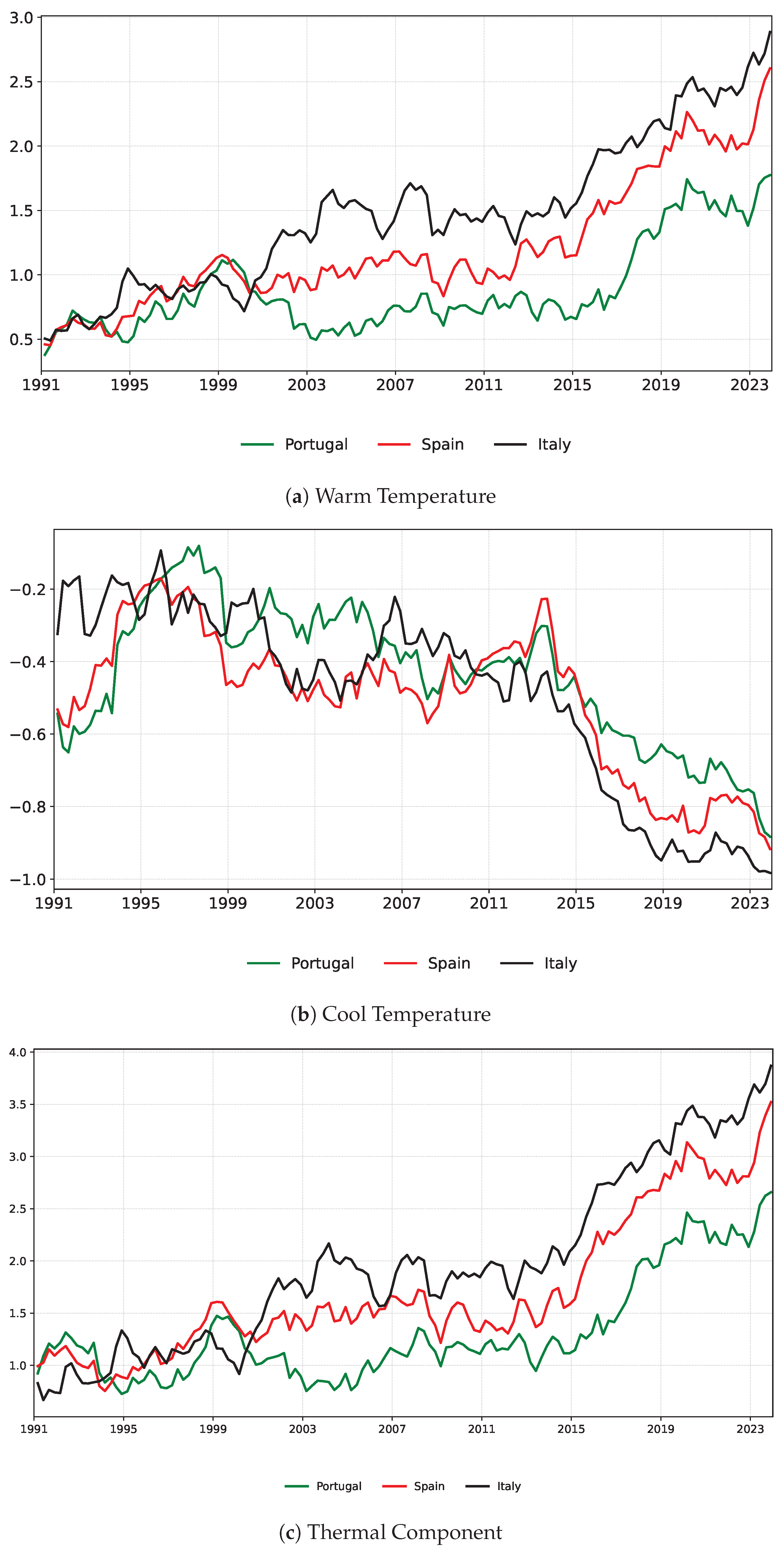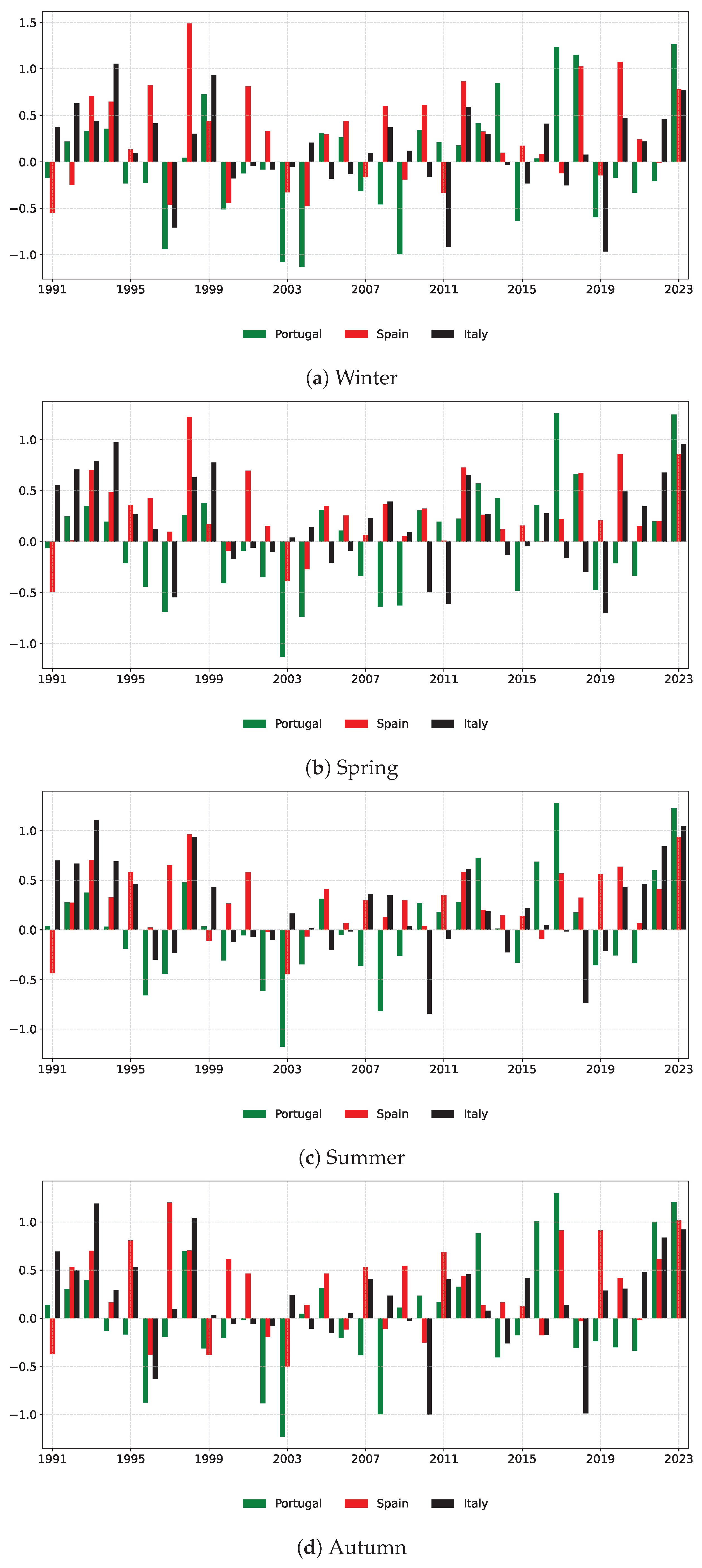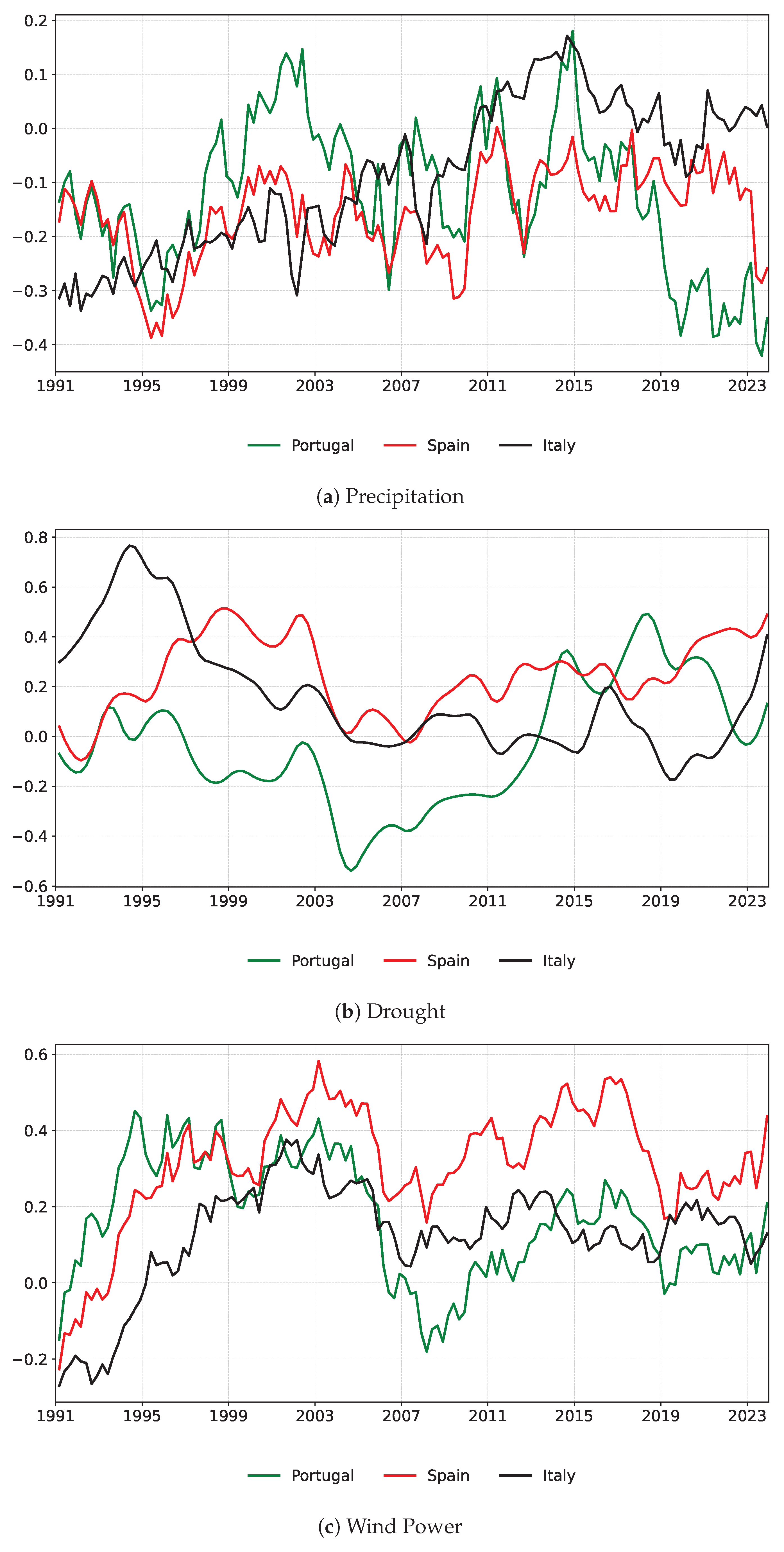 6.2. Cross-Country Trends in Individual Climate Indicators