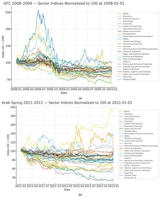 (a) Sector indices during the GFC (2008–2009); (b) Sector indices during the Arab Spring (2011–2012); (c) Sector indices during COVID-19 (2020–2021).