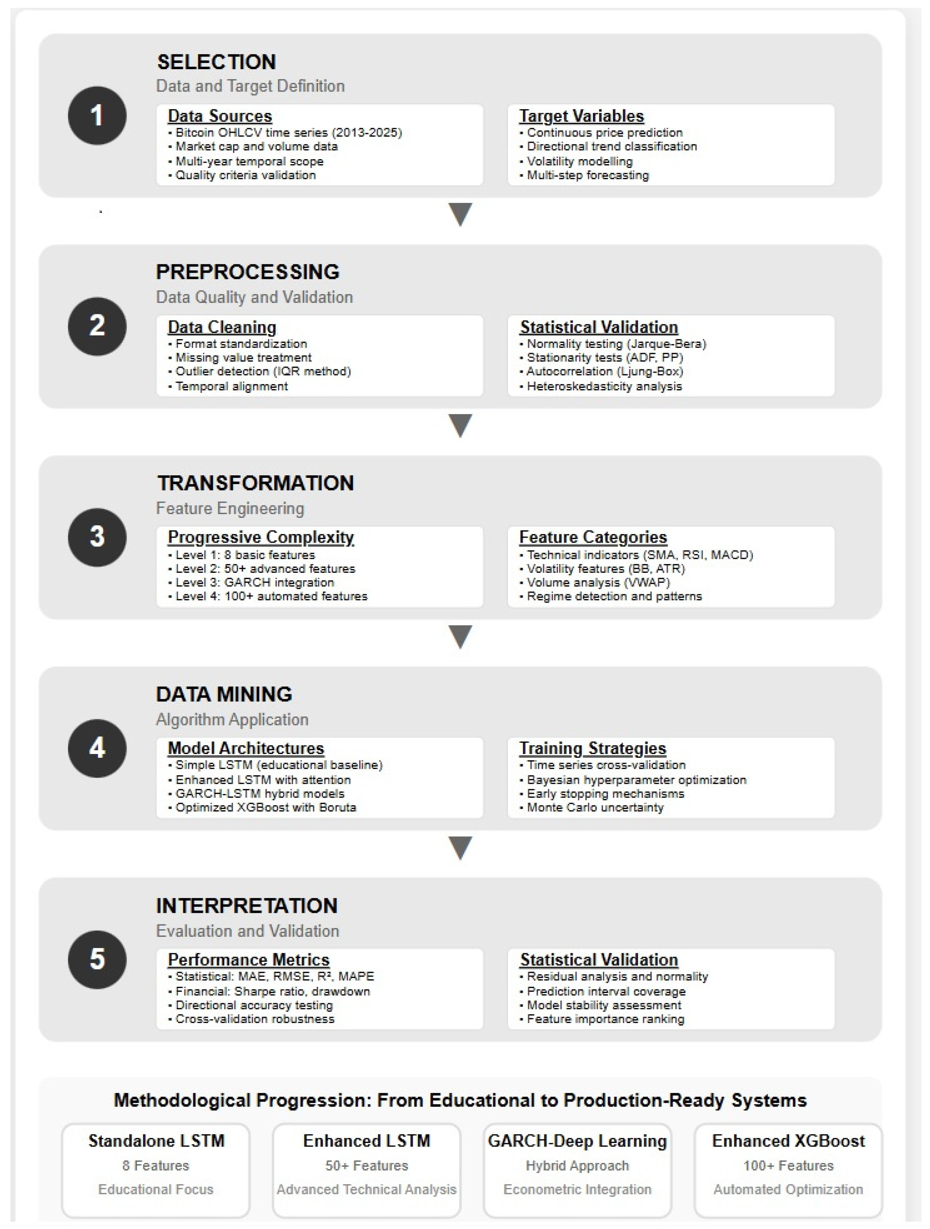 Altogether, the research methodology is based on the systematic application of the Knowledge Discovery in Databases (KDD) framework to cryptocurrency price forecasting (