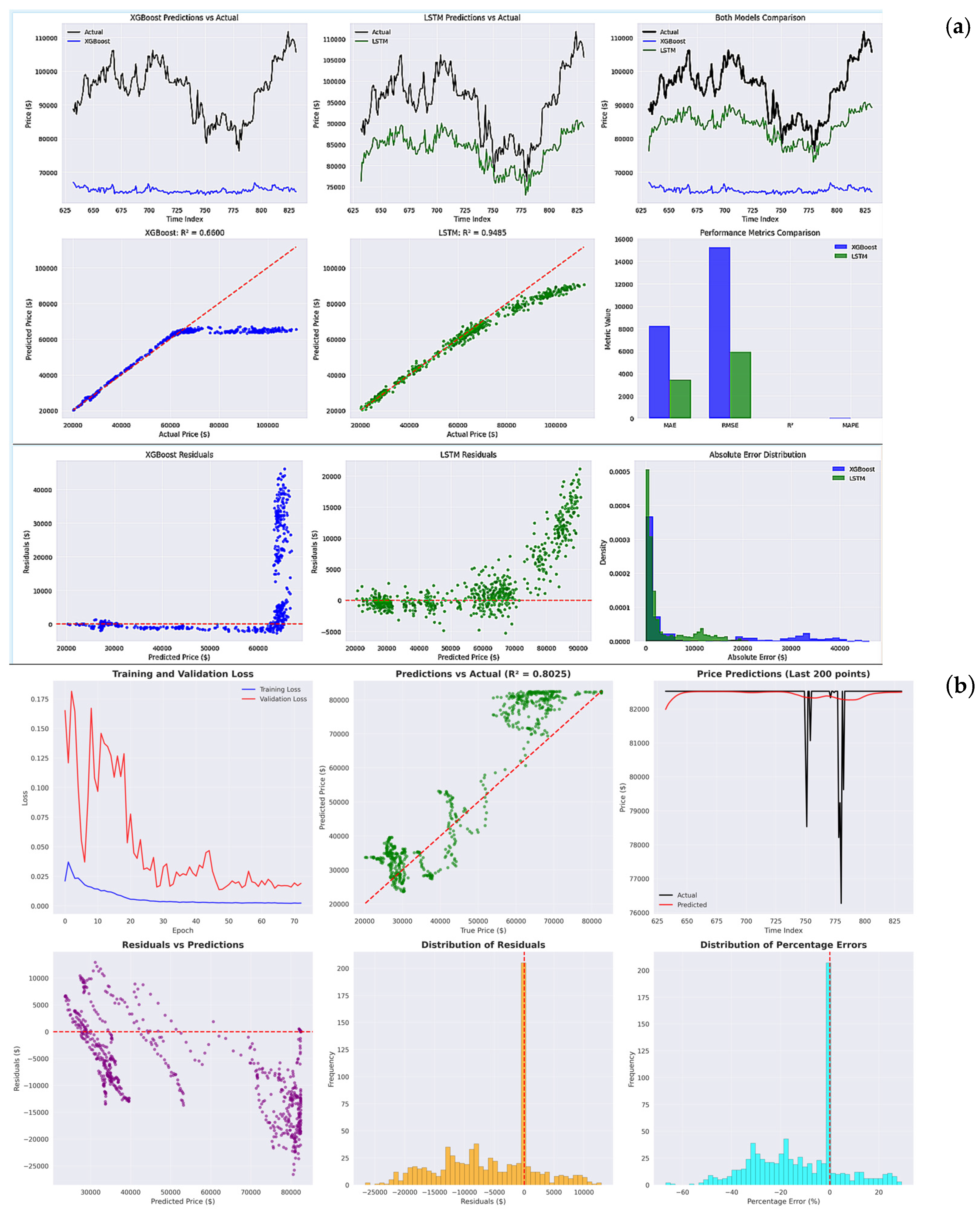 This dramatic performance deterioration suggests severe overfitting despite our validation procedures, highlighting the inherent instability of cryptocurrency markets where regime shifts can render historical patterns obsolete. The LSTM model’s out-of-sample performance particularly deteriorated from its impressive in-sample R2 of 0.9485, demonstrating that even sophisticated neural architectures struggle with distribution shifts in cryptocurrency markets. Similarly, the XGBoost model, despite its exceptional directional accuracy of 81.11% in validation, exhibits substantial prediction errors during extreme market movements, undermining its practical utility for risk management applications.