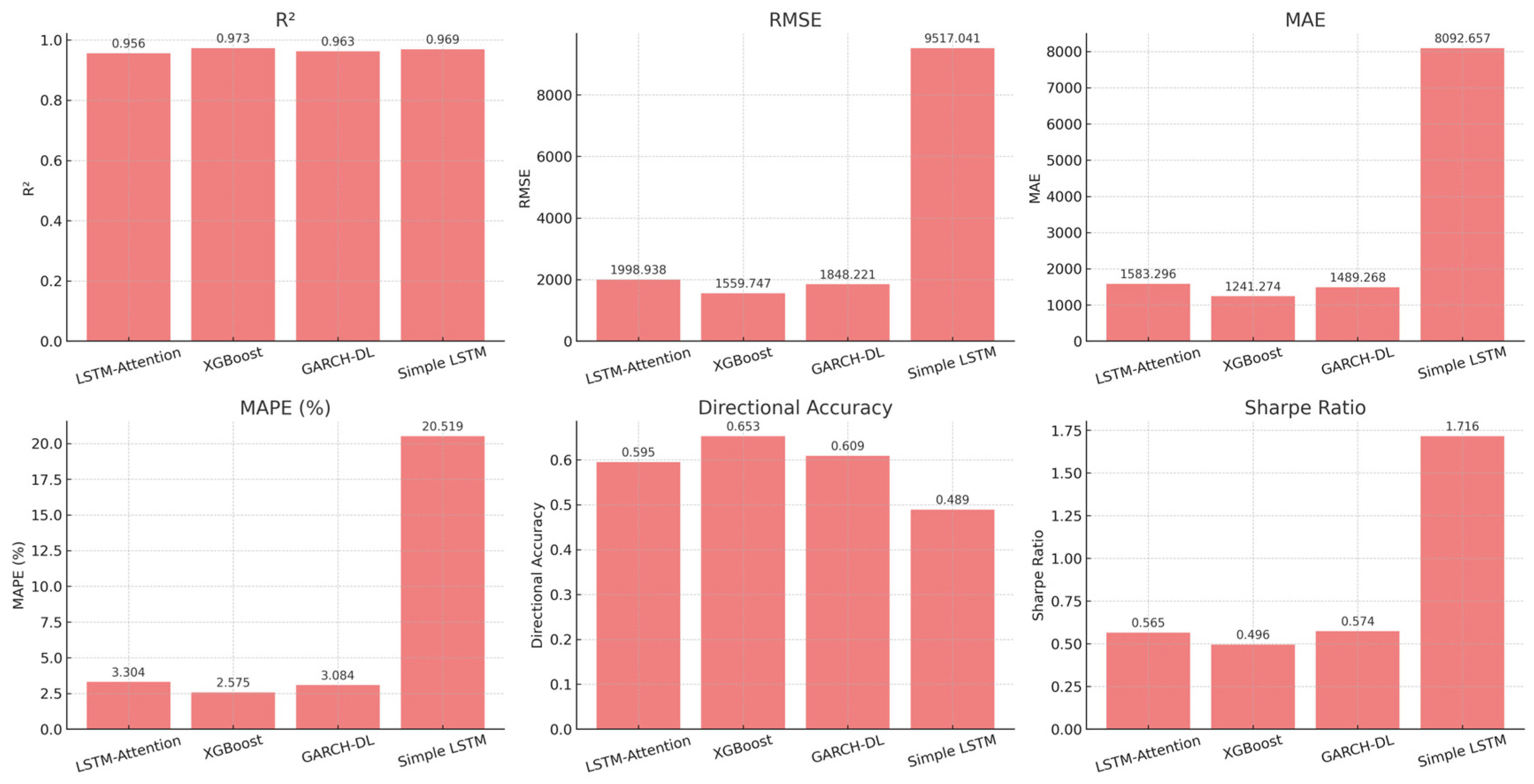 To ensure unbiased evaluation, we implemented strict temporal train–test splits with training data ending 31 December 2023, and testing beginning 1 January 2024. All five models—XGBoost, Simple LSTM, Enhanced LSTM with Attention, Ensemble, and GARCH-DL hybrid—are evaluated exclusively on in-sample and out-of-sample data using identical temporal splits to enable fair comparison and model development.