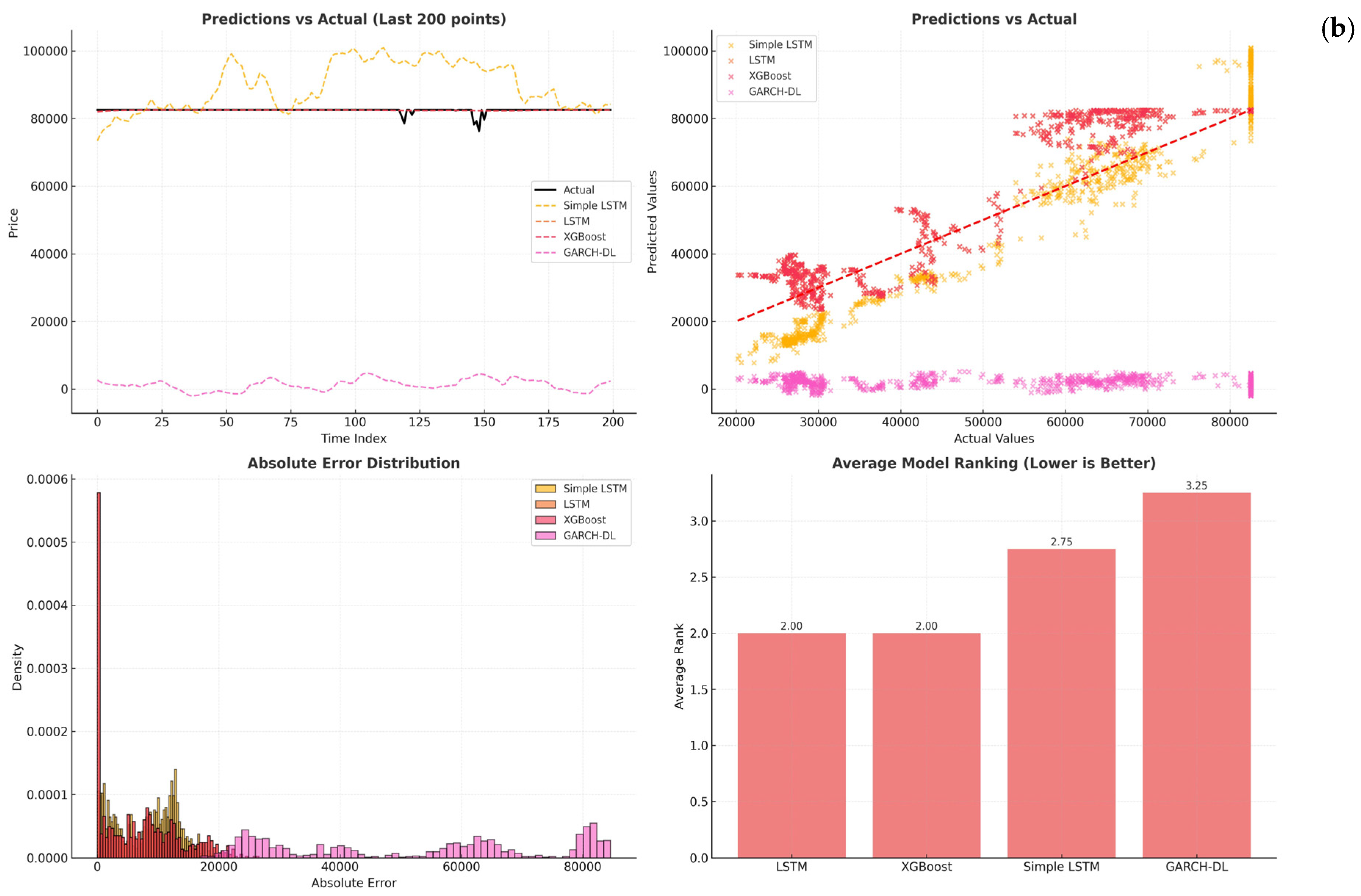 2, RMSE, MAE, and MAPE—into a composite average rank (lower is better). XGBoost outperforms all other models, achieving the top rank (1.33), followed by GARCH-DL (1.83), and Enhanced LSTM. The Simple LSTM ranks last with a mean position of 3.83, corroborating the earlier visual and distributional insights. This composite view provides robust evidence of XGBoost’s superior generalization and the benefits of combining statistical and deep learning paradigms as seen in GARCH-DL.