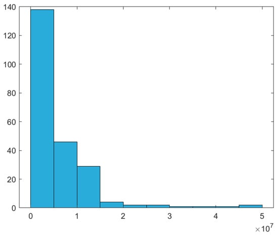 We apply the proposed method to two automobile insurance claim datasets from Indonesia, covering policyholders with comprehensive coverage and expanded third-party liability in the 2019 underwriting year. The first dataset contains the claim frequency for third-party liability, as shown in columns 1 and 2 of Table 5. Among 56,488 policies, 226 claims were reported. Of these, 224 policyholders filed one claim, and one policyholder filed two claims. The sample mean and variance for the claim frequency data are 0.00400 and 0.00402, respectively. The second dataset contains the claim severity for third-party liability and consists of 226 observations. The sample mean and standard deviation for the claim severity data are IDR 5,760,172 and IDR 7,162,913, respectively. Figure 1 shows a histogram of the claim severity data.