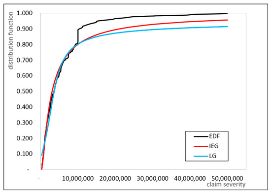 The K–S test statistic values for the IEG and LG distributions are 0.0951 and 0.0973, respectively. The critical value of the K–S test at the 1% significance level is 0.1011 (Sheskin 2000). Thus, both the IEG and LG distributions are suitable for modeling third-party liability claim severity data. Figure 2 shows the empirical distribution function (EDF) and the cumulative distribution function curves for the IEG and LG distributions. The cumulative distribution function curve of the IEG distribution is closer to the EDF, indicating that the IEG distribution provides a better fit to the data than the LG distribution. This conclusion is supported by the lower K–S test statistic and higher log-likelihood value for the IEG distribution.