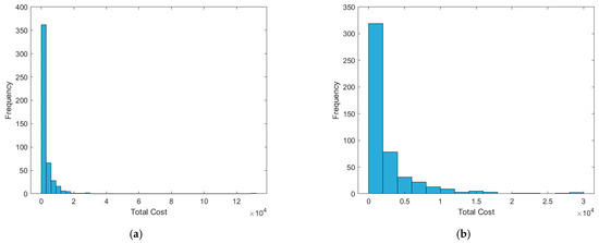 Histogram of the total cost: (a) all observations; (b) total cost truncated at 30,000.