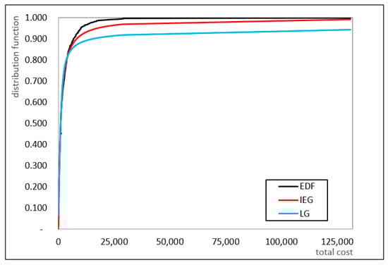 The K–S statistic for the IEG model (0.0361) is lower than that of the LG model (0.0926) and below the 1% critical value of 0.0687 (Sheskin 2000), indicating a superior fit for the total cost. As illustrated in Figure 4, the cumulative distribution function of the IEG model closely follows the empirical distribution, further supported by its smaller K–S value and higher log-likelihood.