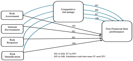 This conceptual framework examines the direct influence of Enterprise Risk Management (ERM) practices—specifically Risk Assessment, Internal Environment, Risk Response, and Risk Identification—on the performance of non-financial firms (NFP). Additionally, it explores the mediating effect of Competitive Advantage (CA) within this relationship, as shown in Figure 1.