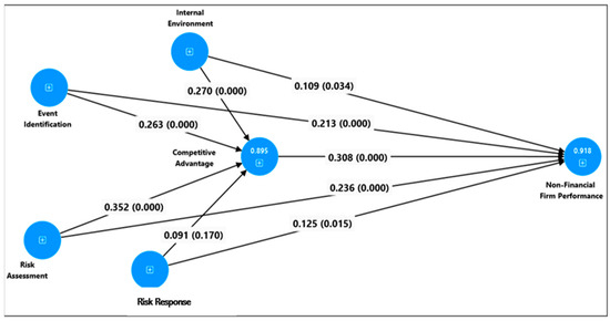Notes: N = 439. OS/Beta = standardised path coefficient estimated using Partial Least Squares Structural Equation Modelling (PLS-SEM); SD = standard error of the bootstrapped estimate; LL and UL = lower and upper bounds of the 95% bias-corrected confidence interval; t = bootstrapped t-statistic based on 10,000 resamples; p = two-tailed significance level. Mediation indicates whether Competitive Advantage (CA) partially mediates the relationships between Enterprise Risk Management (ERM) practices and Internal Environment (IE), Event Identification (EI), Risk Assessment (RA), Risk Response (RR) and Non-Financial Performance (NFP). Significance is denoted at p < 0.05. Paths with confidence intervals that do not include zero are interpreted as significant.