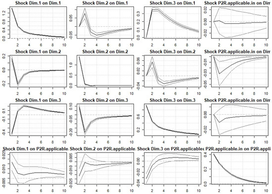 Furthermore, IRFs are derived from the posterior distribution of model parameters to trace the dynamic response of P2R to shocks in each PCA-derived factor over time. Strictly speaking, an IRF describes the effect of a one-unit structural shock at time t on the vector of endogenous variables , holding all other shocks constant. In our analysis, or to be general, in a BVAR framework, these responses are computed from the posterior draws of coefficient matrices and the structural impact matrix B such that: