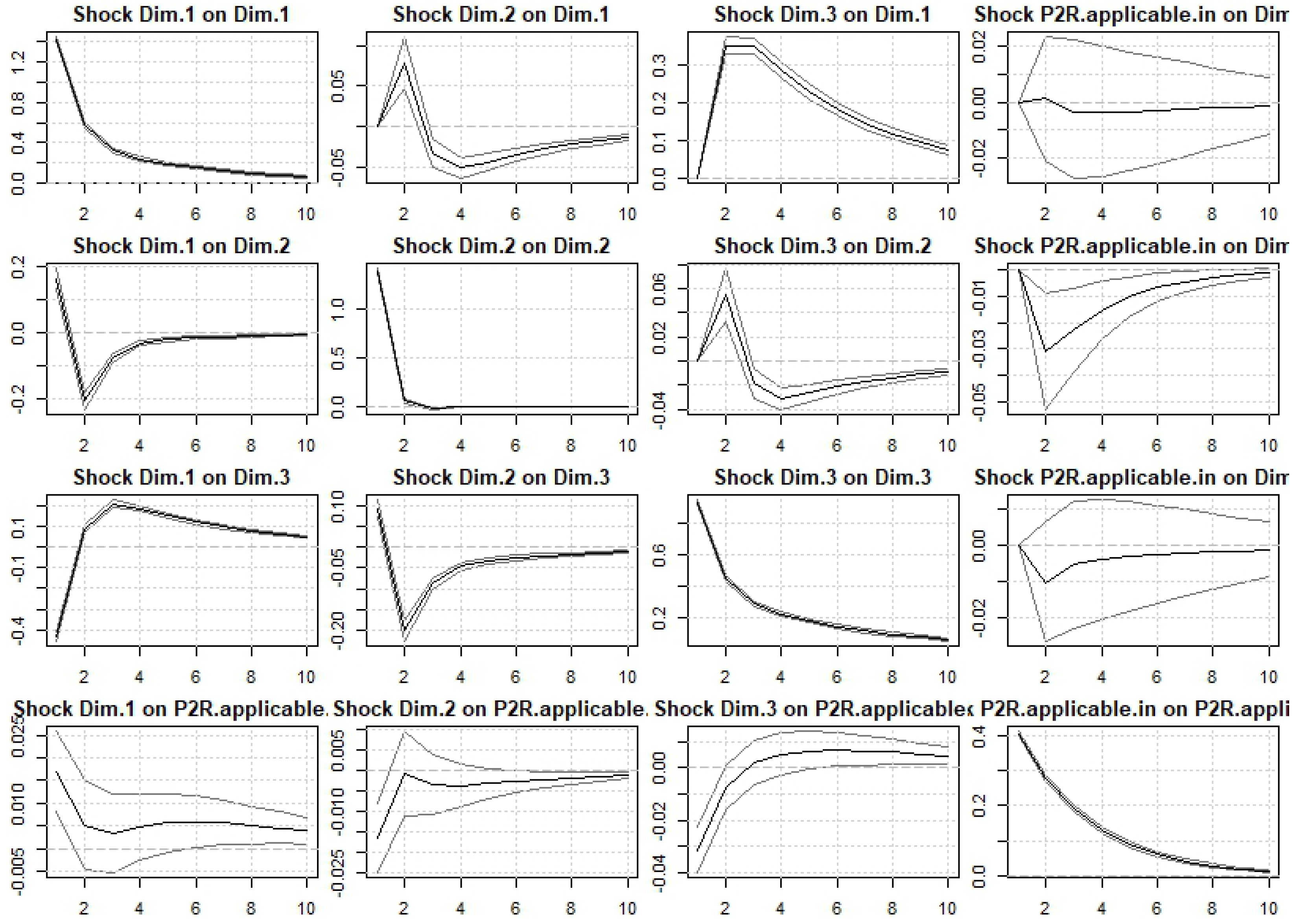 Figure 1. Impulse response functions from the BVAR model including principal components and supervisory capital metric. The BVAR model is specified with four variables: the first three principal components (Dim.1–Dim.3) extracted from the macroeconomic dataset, and the supervisory capital metric (P2R.applicable.in).