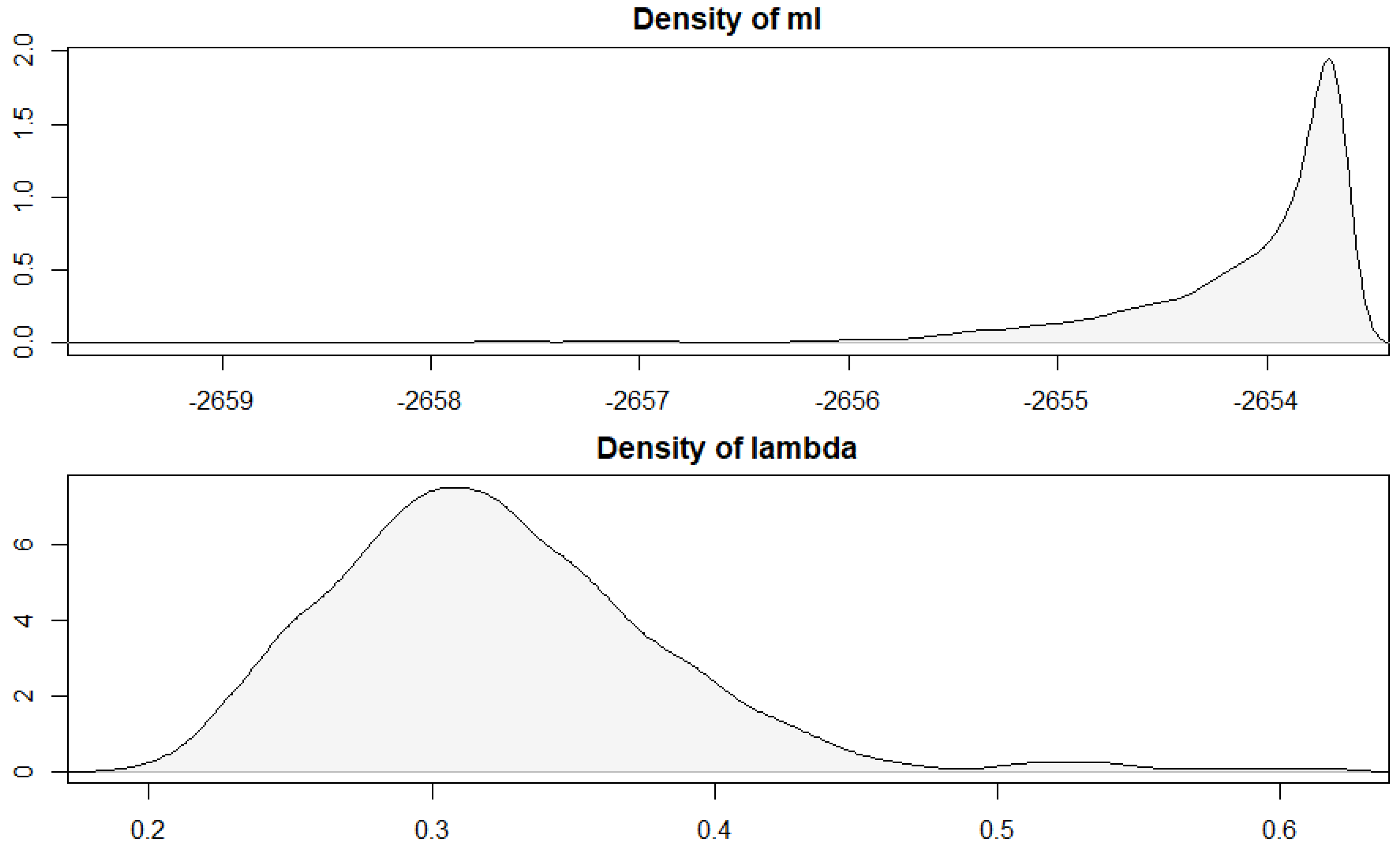 Figure A1. Posterior densities of marginal likelihood and shrinkage Parameter.