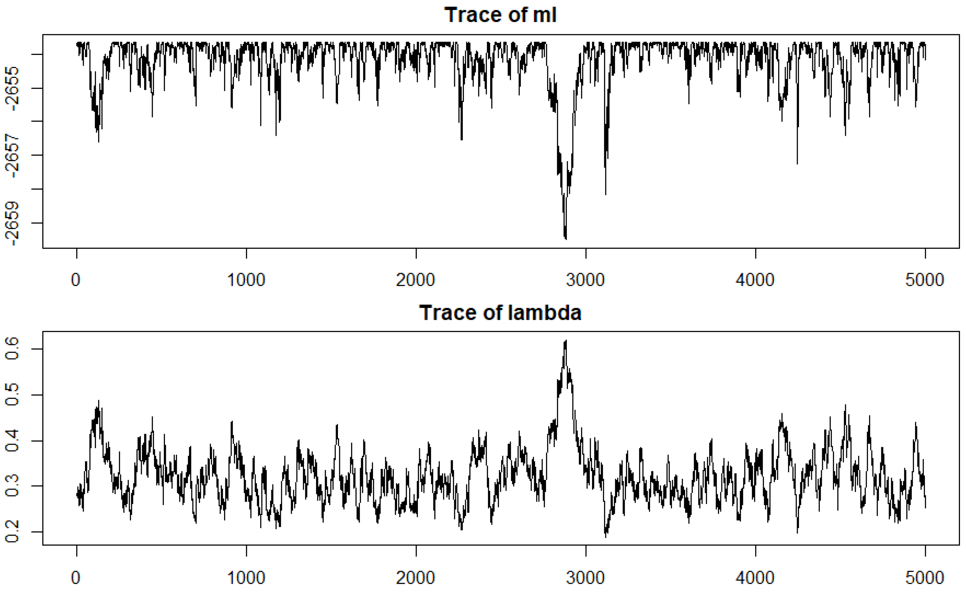 Figure A2 shows the trace of λ similarly indicates stable mixing around a central value near 0.3. Although it shows more pronounced local fluctuations, particularly between iterations 2500 and 3500, the overall behavior suggests the chain has reached its stationary distribution.