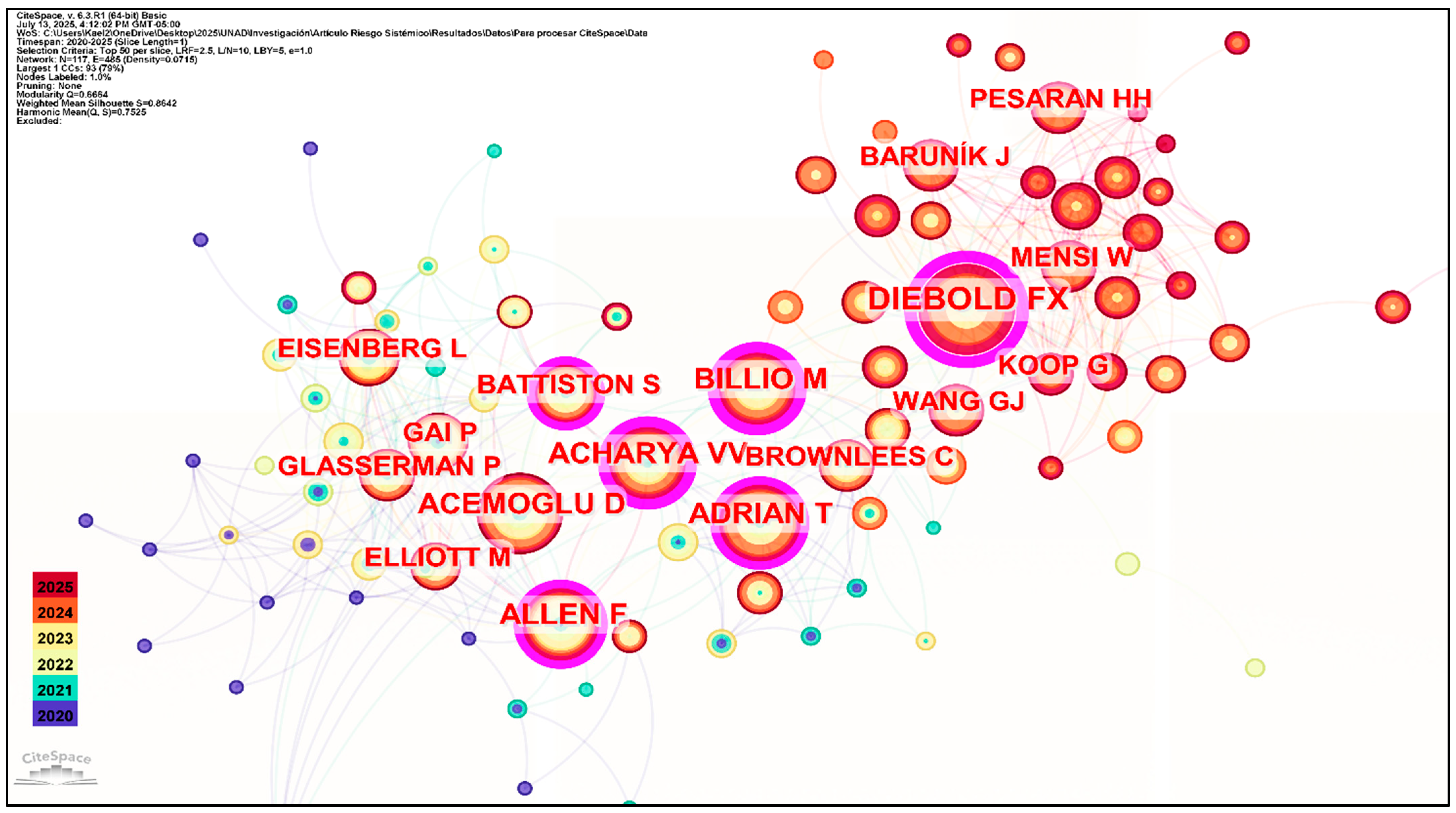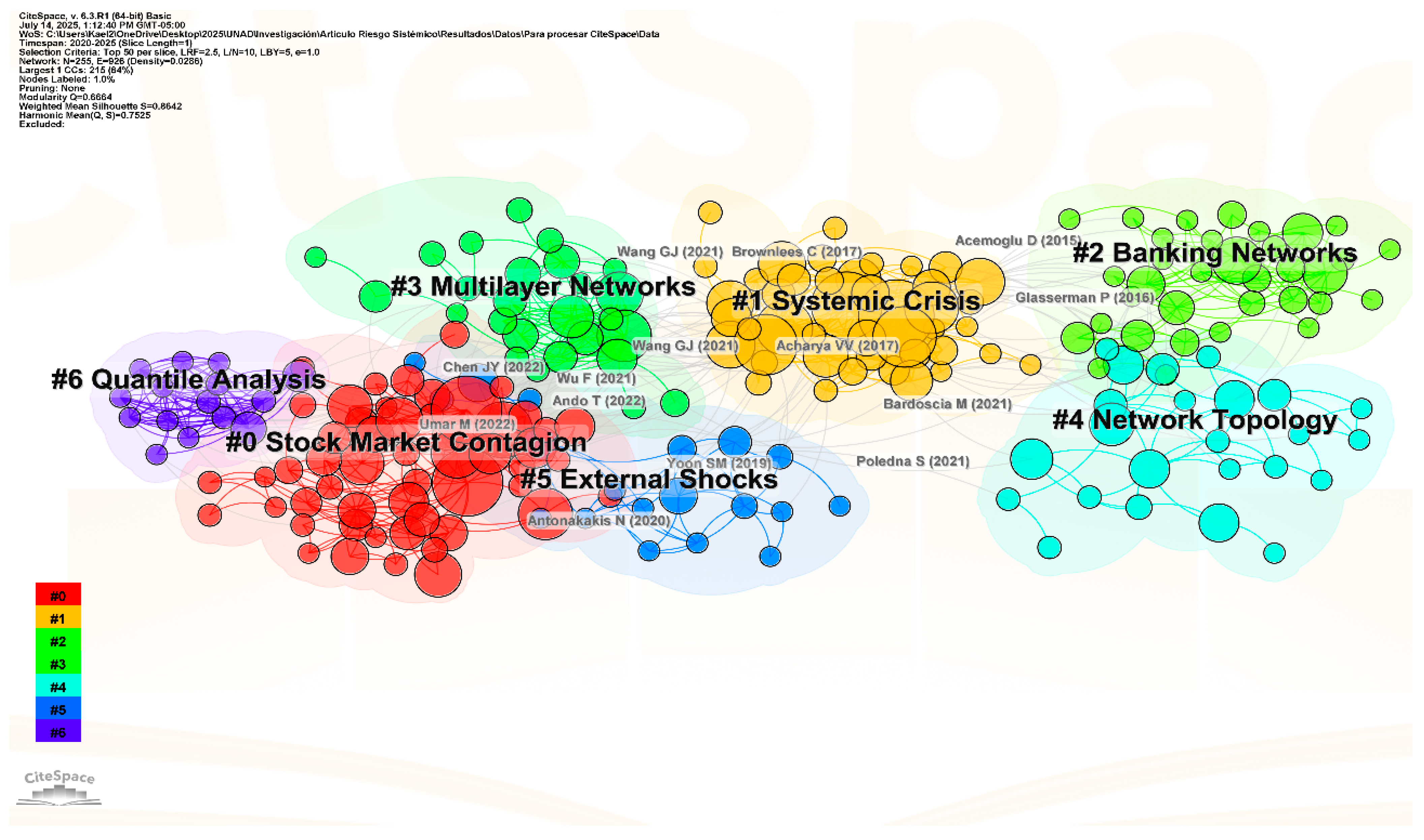 - Bibliometric synthesis and discussion of findings: The results were integrated with the theoretical and empirical literature on systemic risk, highlighting models, approaches, and the application of network analysis.