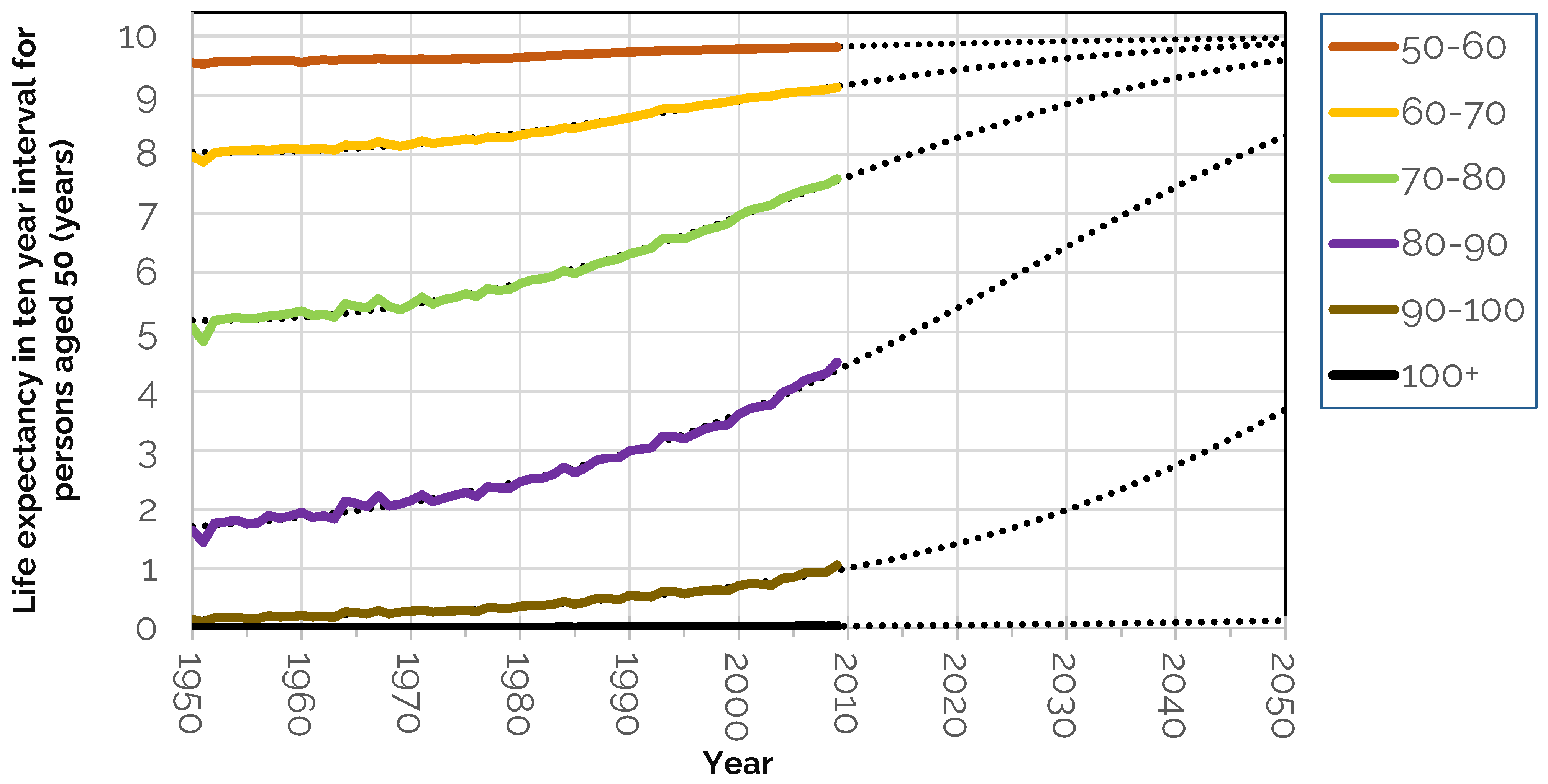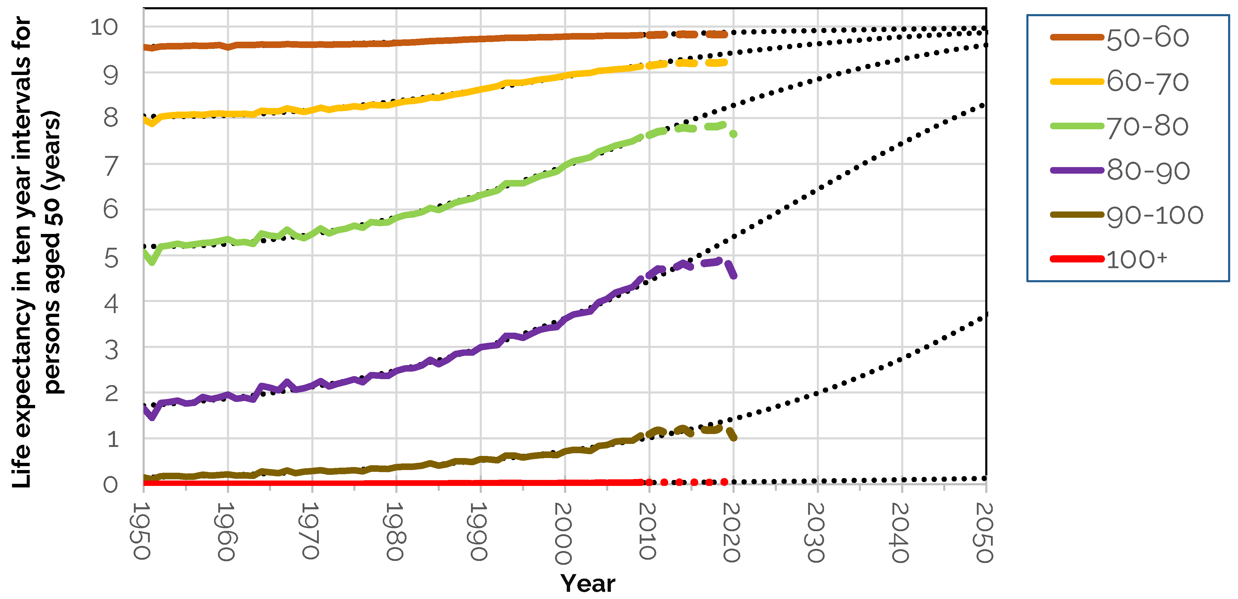 2015) show that partial life expectancy is additive, meaning that the accumulated gain equates to the expectation of remaining life by aggregating across the decades. This property means we can examine trends within each decade of life to pinpoint in which age intervals future increases in life expectancy are more likely to occur.