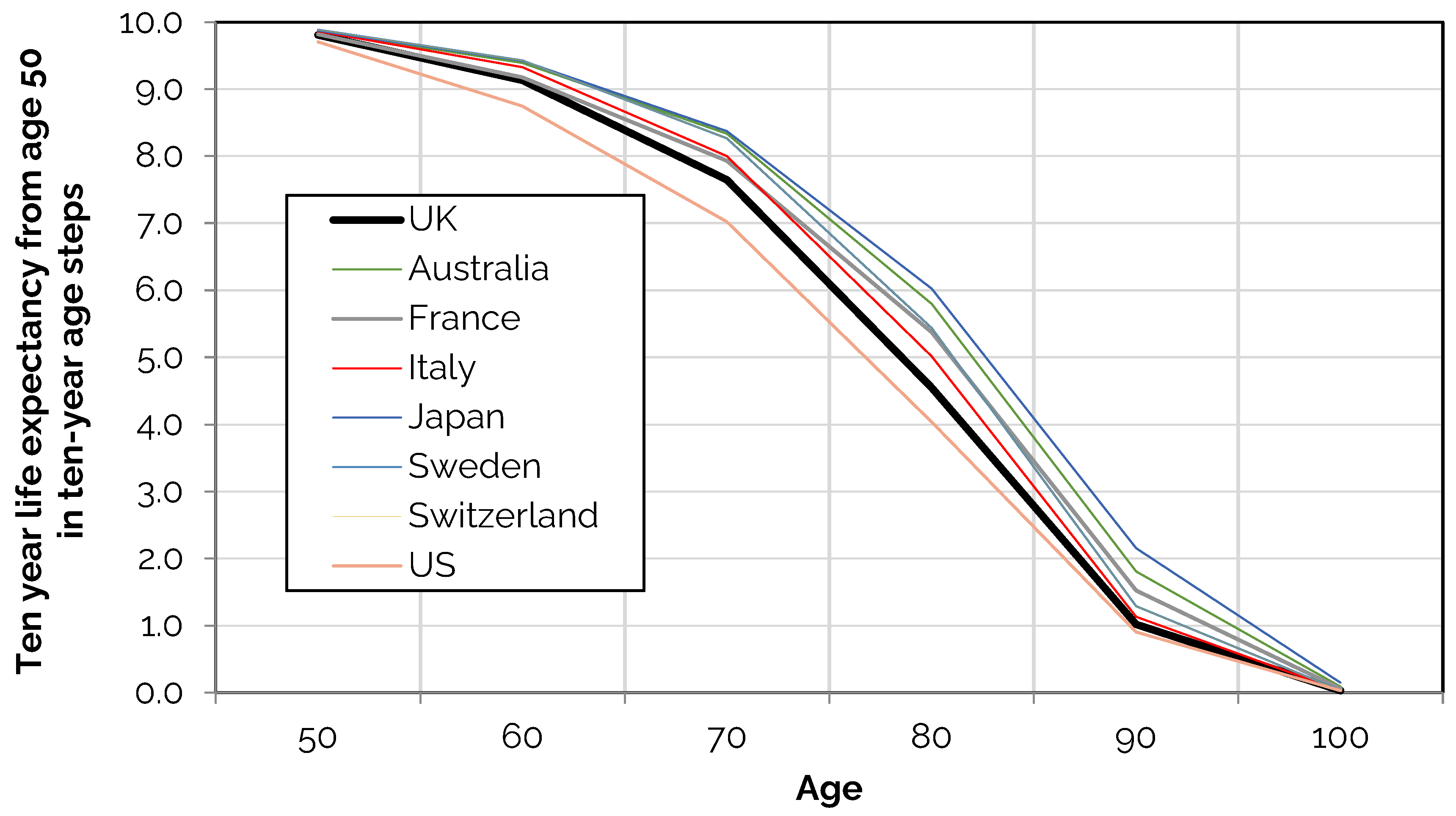 Figure 3 show the extra years out of the next ten a person can expect to live by ten-year age interval in eight leading countries in 2020. The total at the foot of each column is life expectancy at age 50 and is lower in the UK than in every country except for the US. The same applies in each individual age category with countries including Australia, France, Italy, Japan, Sweden, and Switzerland all doing better.