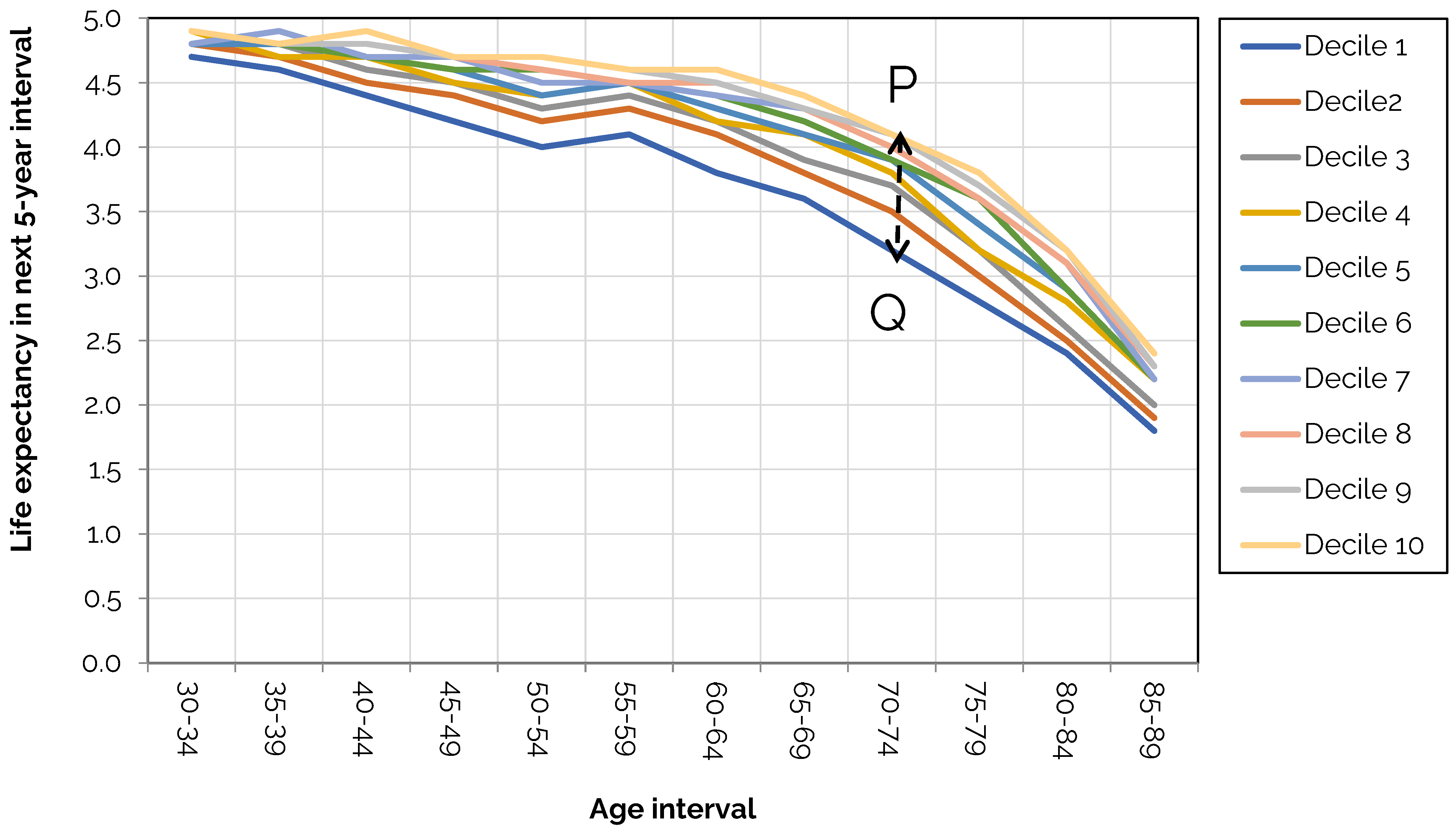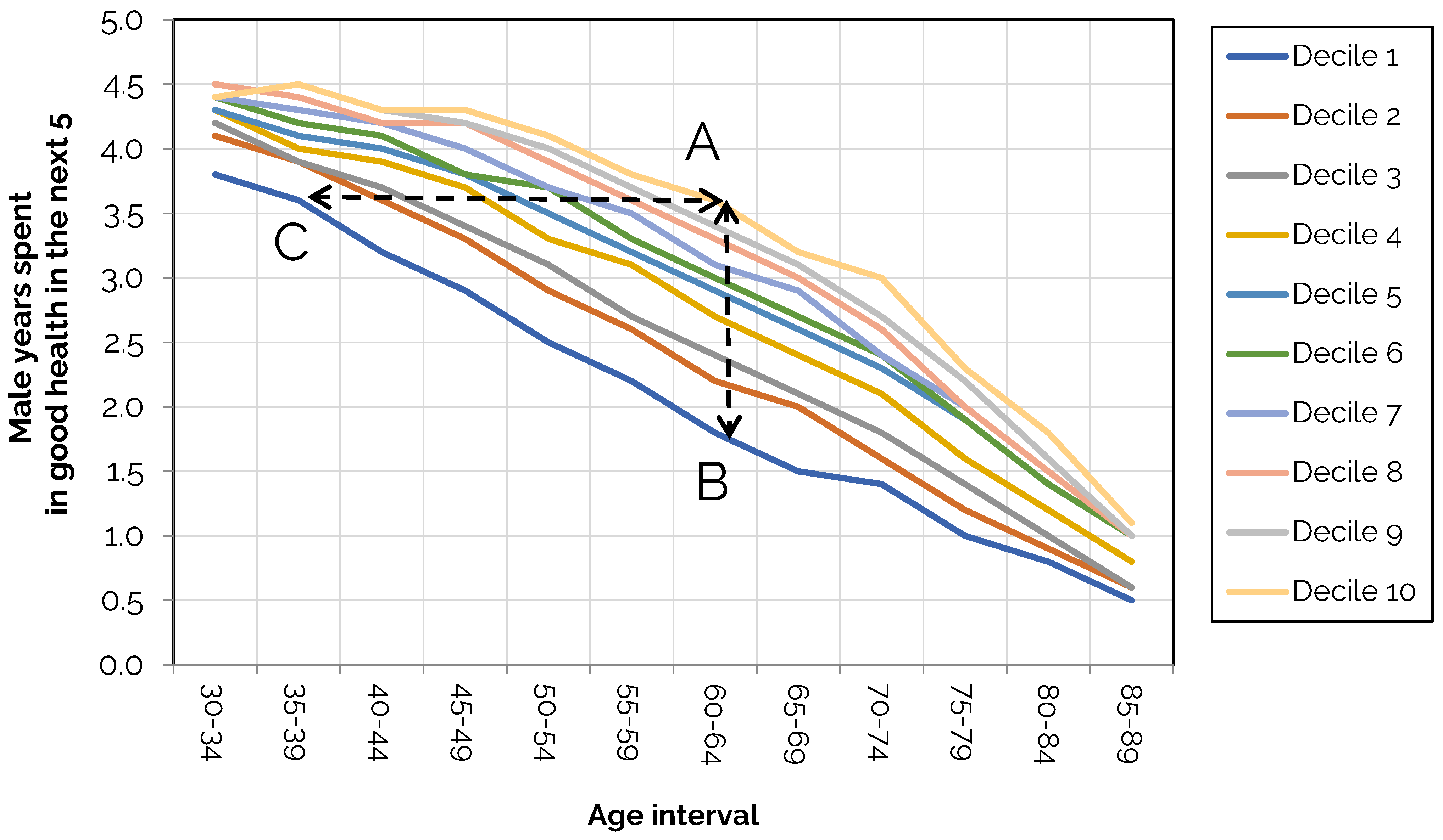 We also see that a male aged 60 to 64 in decile 10 has the same expectation of good health as a man aged 35 to 39 in decile 1 as denoted by the dotted line (A to C). As