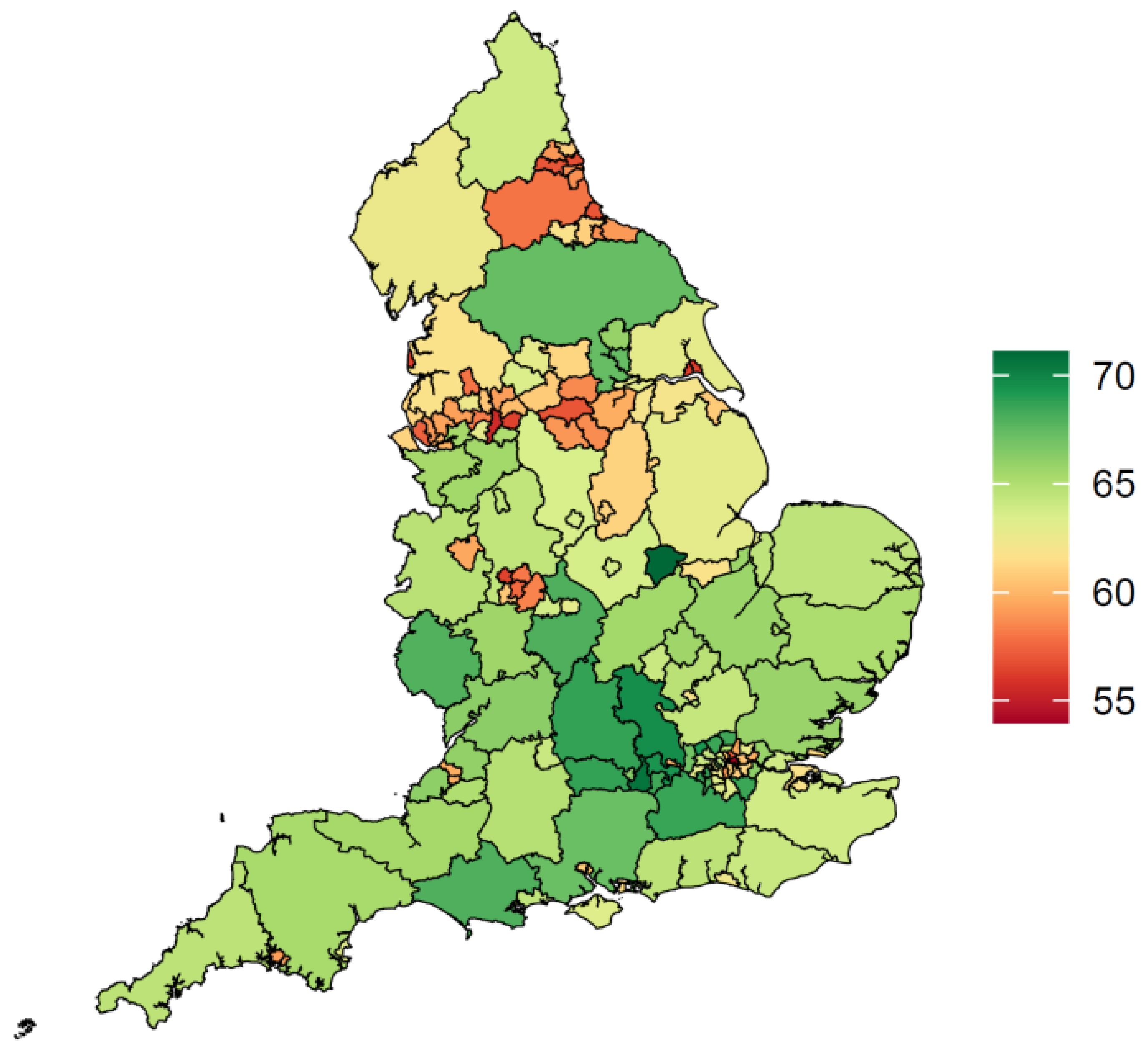 2024), highlights a characteristic spatial footprint of health expectancy, with northern urban areas of England doing significantly worse than the south, with some exceptions in more rural areas.