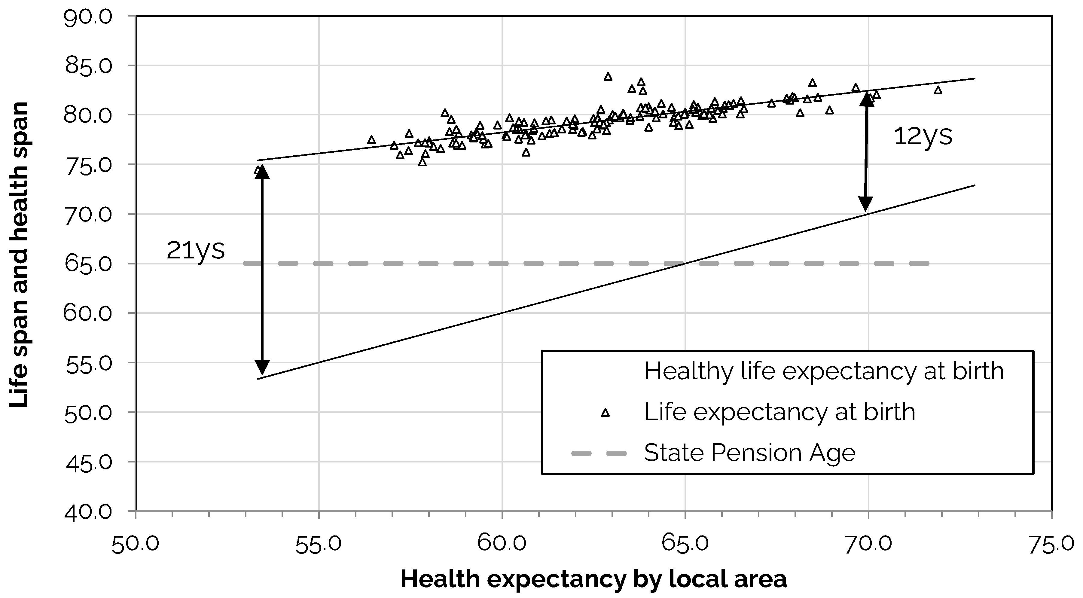 The asymmetrical relationship found between health and life span at the sub-national level resulted in deprived areas spending more years in poor health, as well as a greater proportion of their lives (