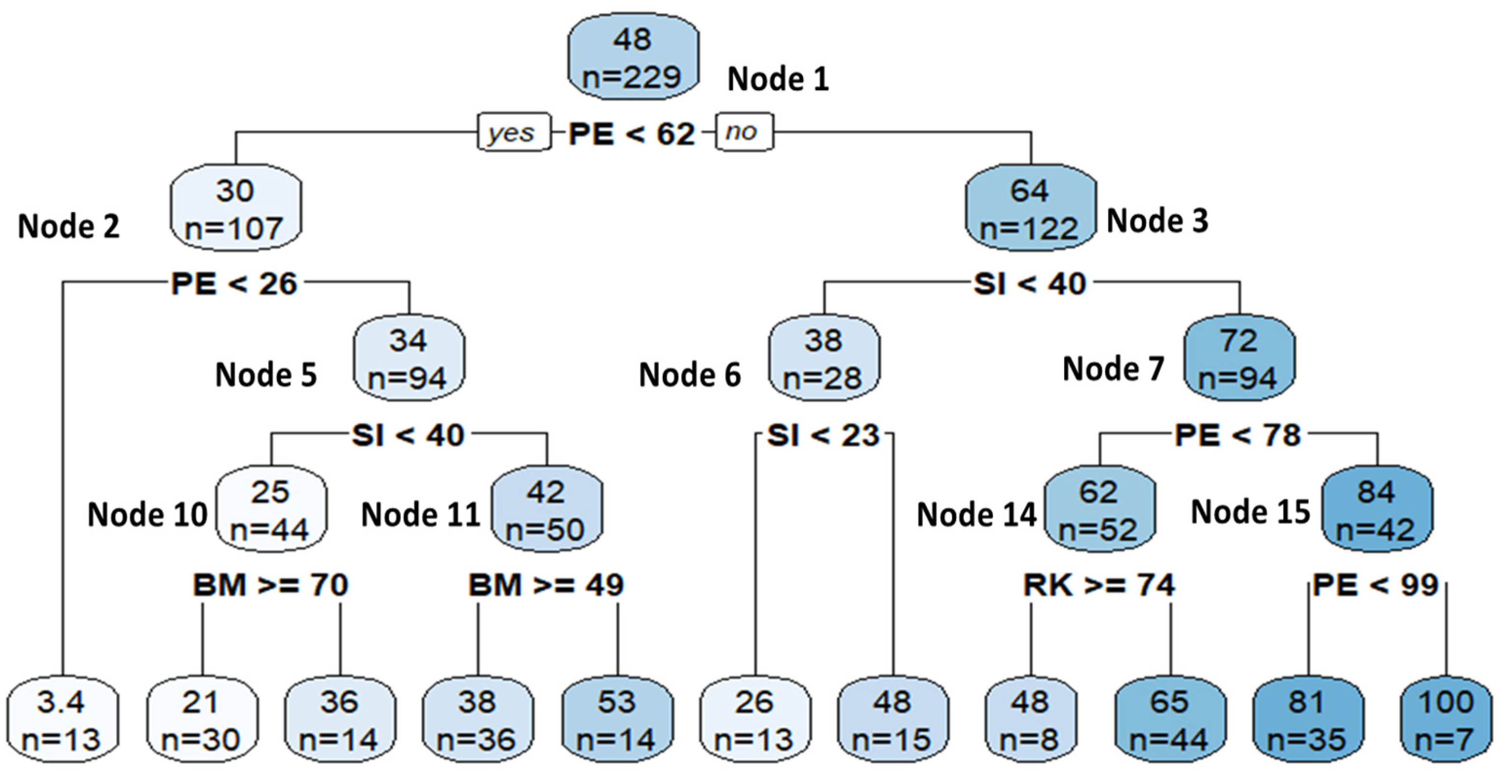 | PE < 62 | PE < 26 | SI < 40 | SI < 40 | SI < 23 | PE < 78 | BM ≥ 70 | BM ≥ 49 | RK ≥ 74 | PE < 99 |
