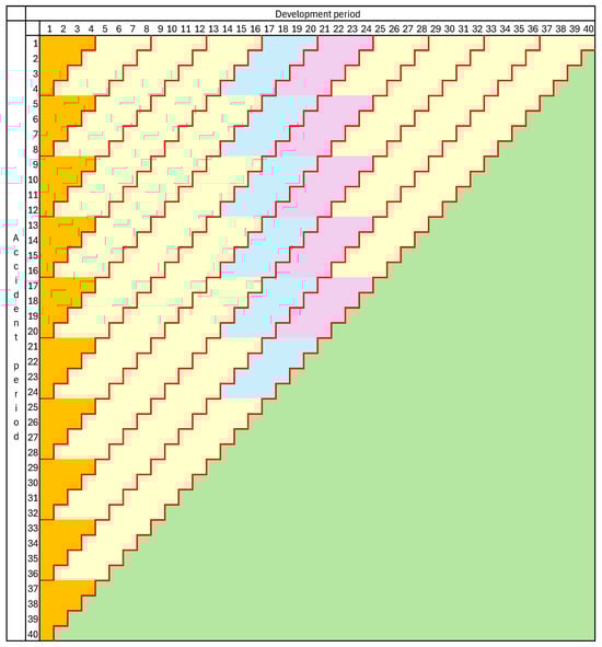This aggregation from single-unit to -unit periods is commonly used in commercial practice. It is illustrated in Figure 1, in which a quarterly array is collapsed to a yearly array (). The upper triangle, representing past data in a loss reserving context, is shaded yellow, the lower green. Calendar years are delineated by the red diagonals.