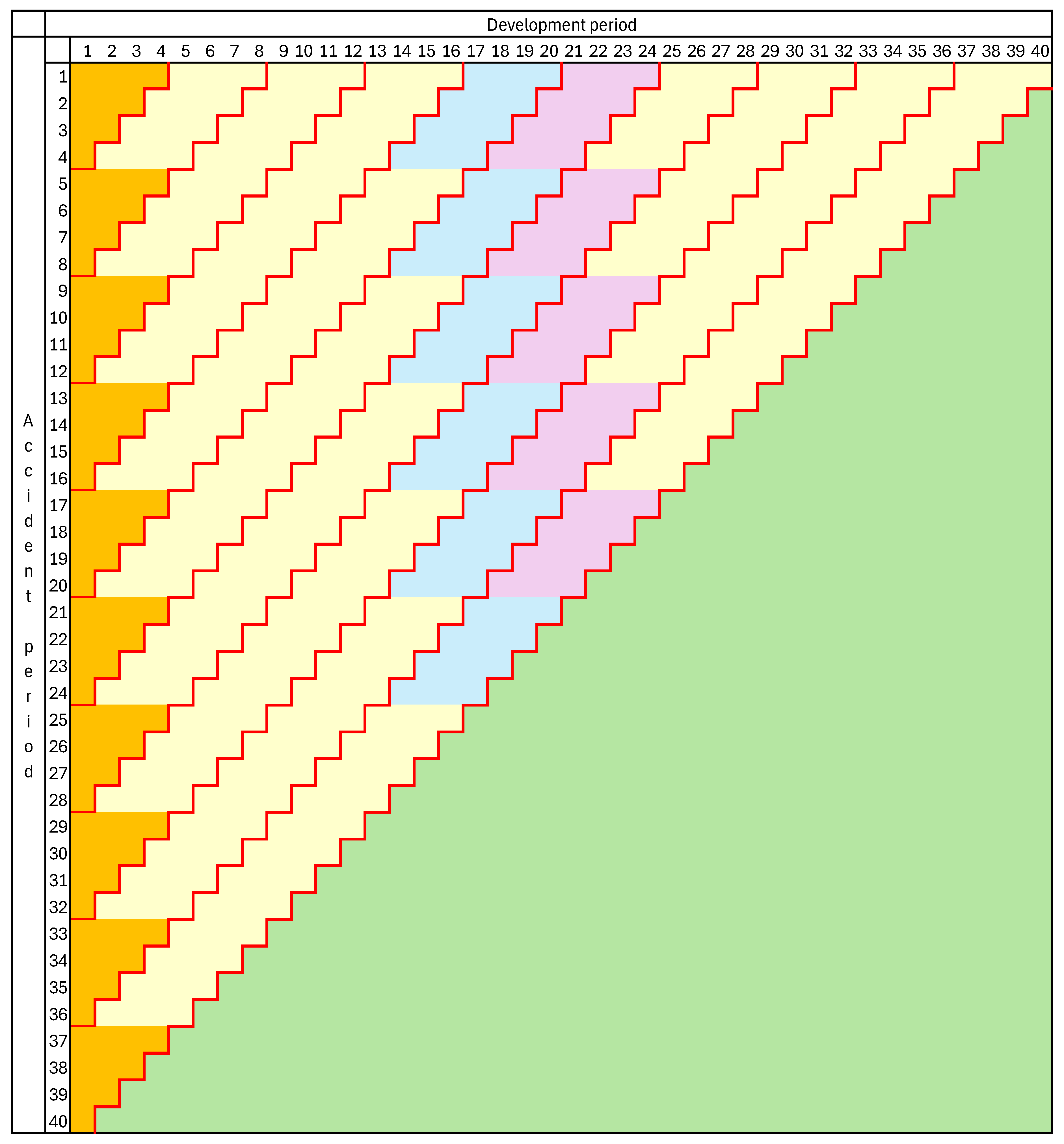 Development years 5 and 6 are shaded blue and purple, respectively. Note their nature, as staggered aggregations of accident quarters. Development year 1 is also shaded orange to illustrate its exceptional nature.