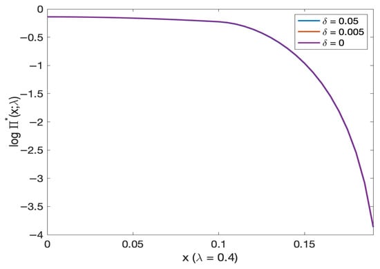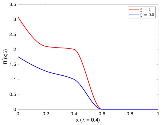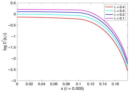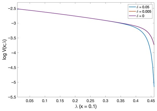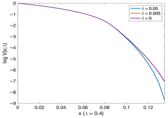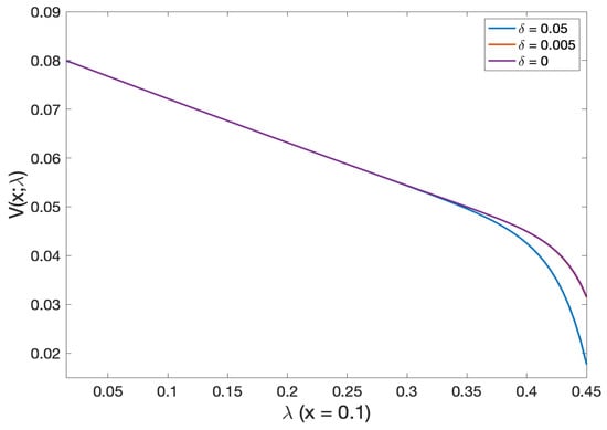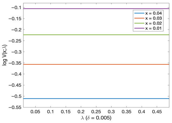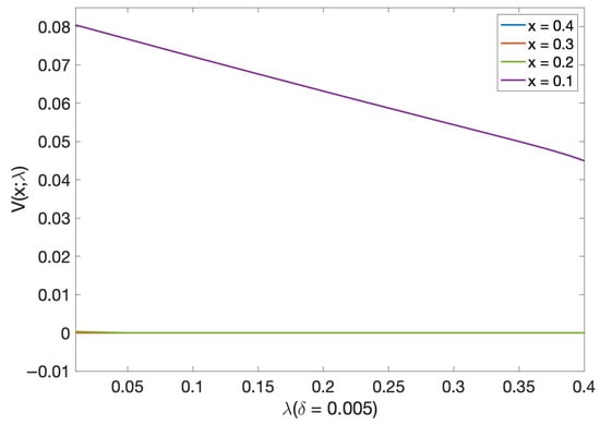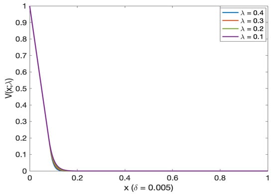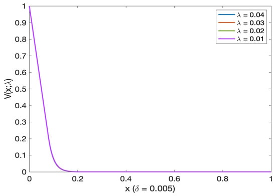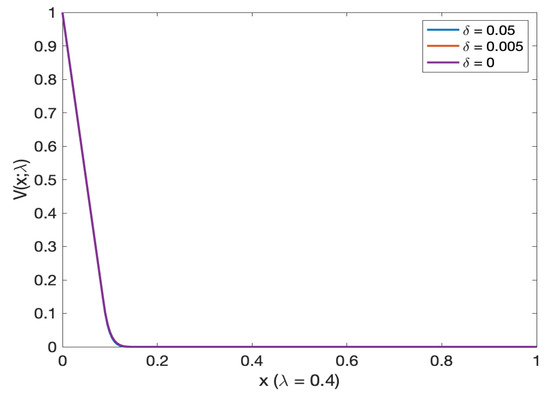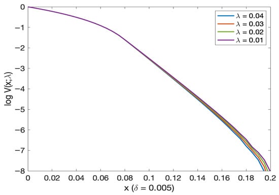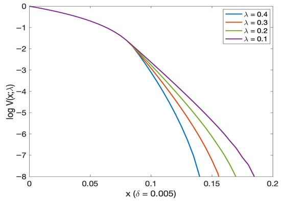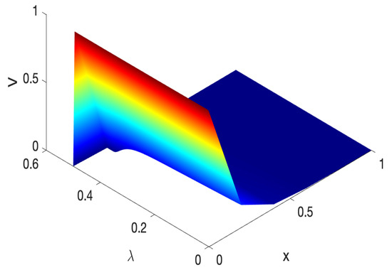 Because is continuous and strictly decreasing in x (as shown in our numerical results), there exists a unique solution to (15) for each . Thus, the value function computed from the dual PDE, in a purely numerical procedure, can be directly inverted along the x-axis to obtain the reserve function for any desired tolerance .