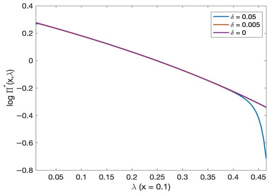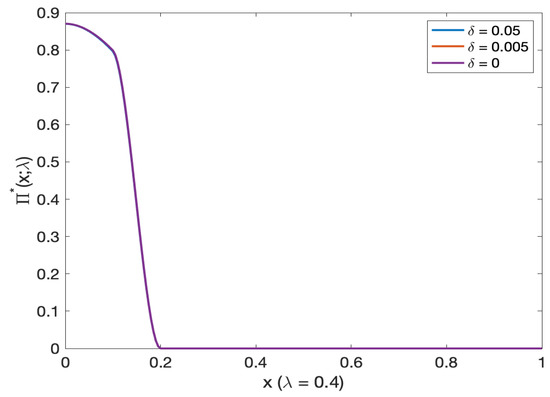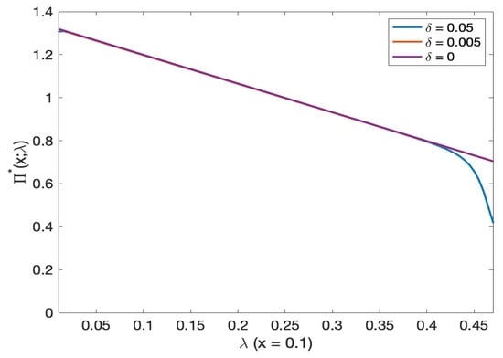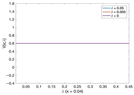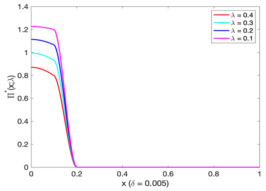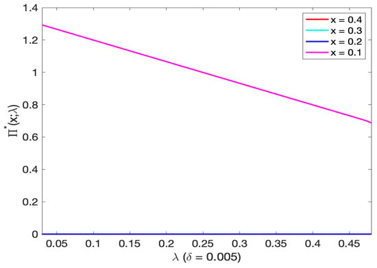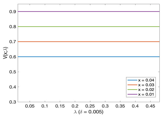 Additionally, we see from Figure 9 that the probability of default decreases as the mortality intensity increases, as expected. Suppose the initial mortality intensity is higher than 0.1. The probability of default is very close to zero. In addition, the curves corresponding to , , and are identical to zero.