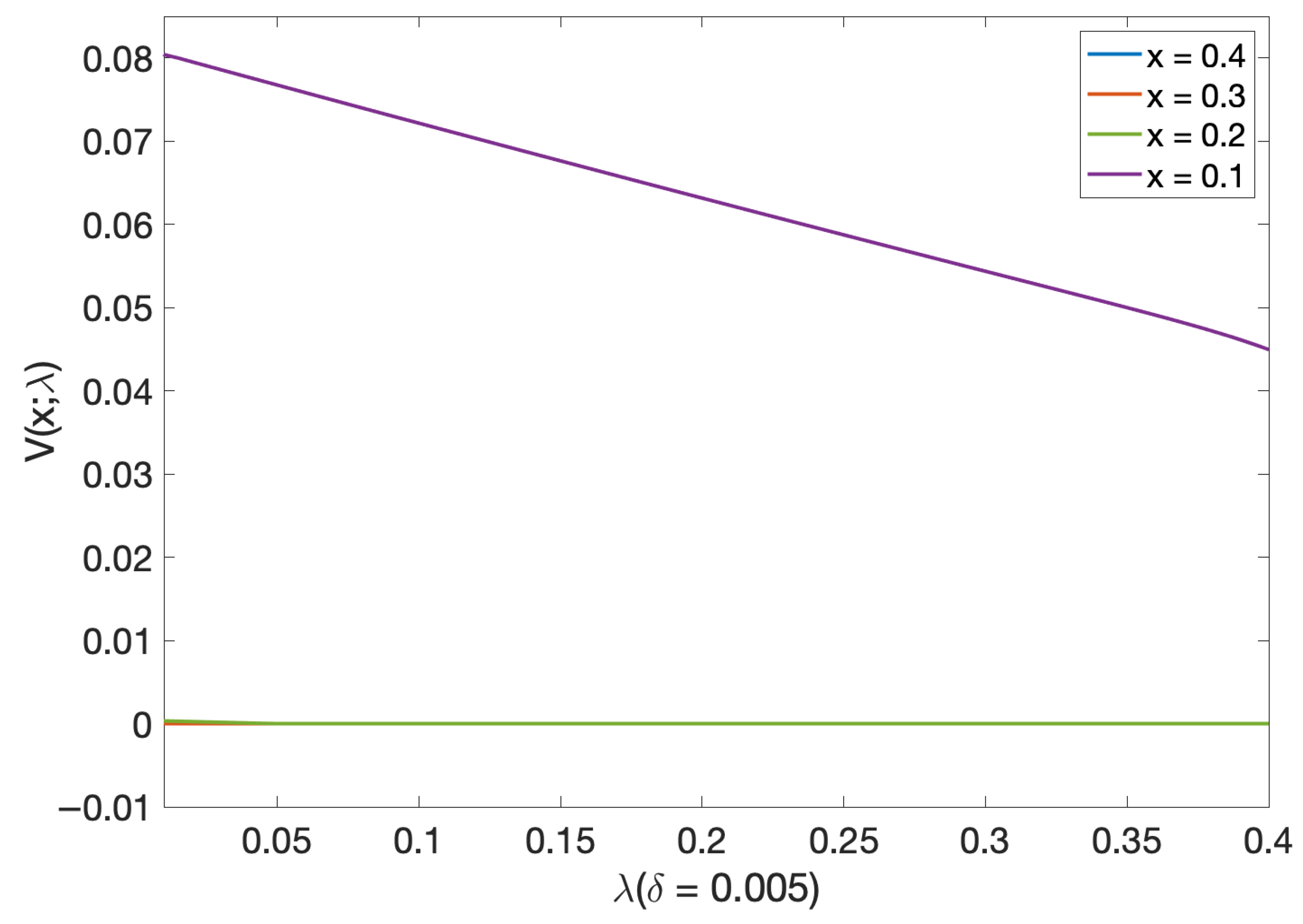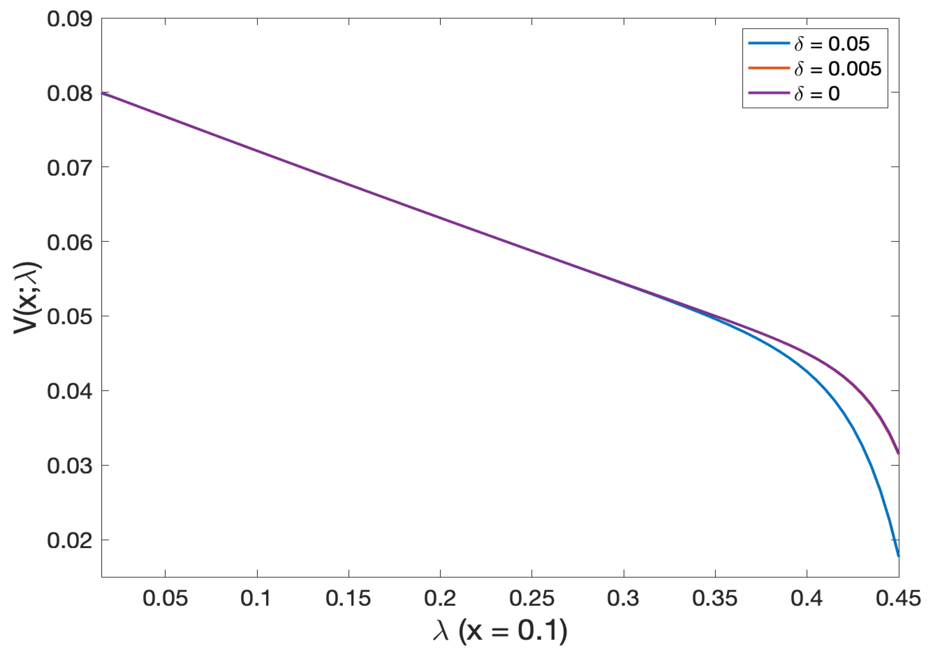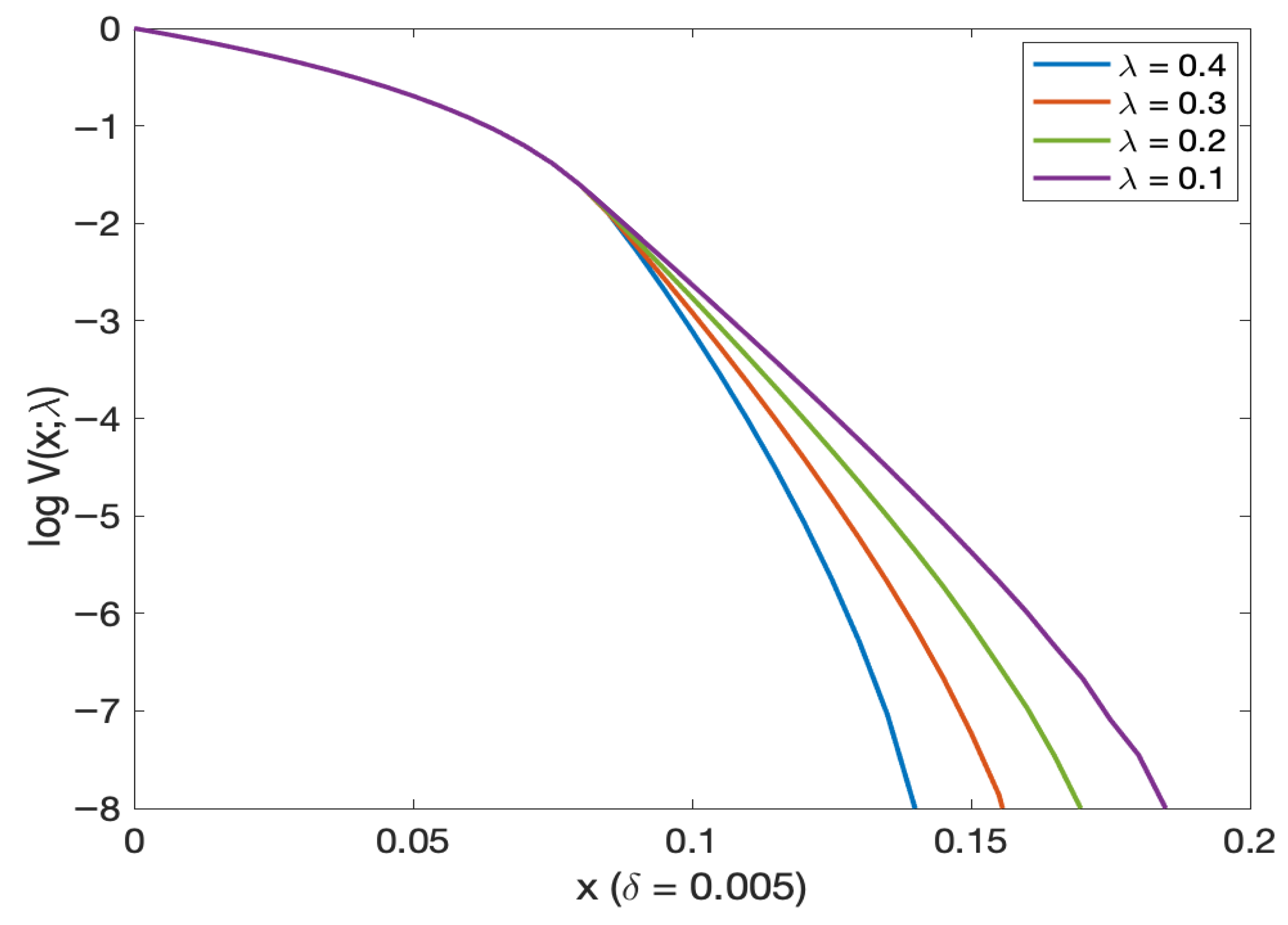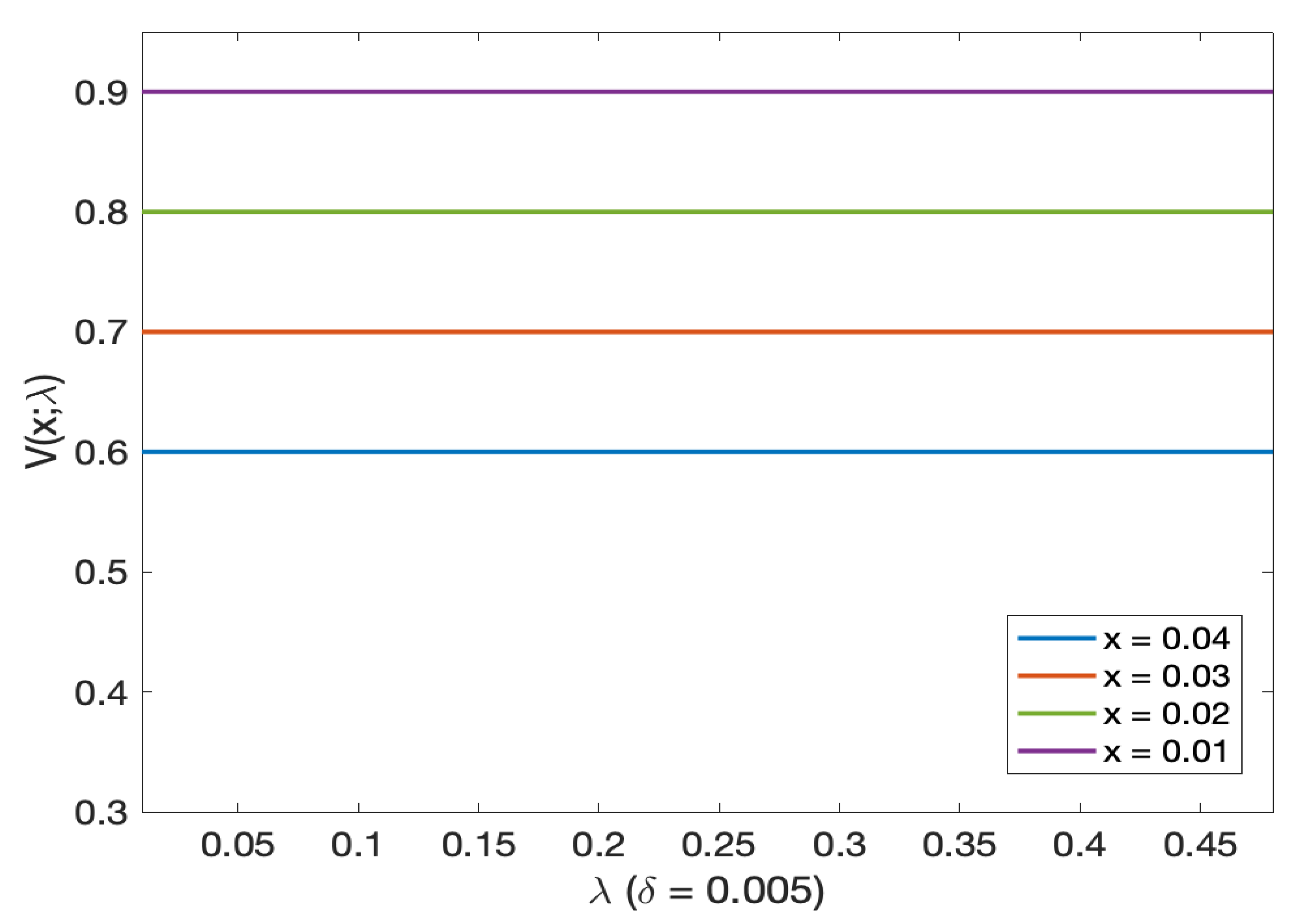 In our work, the value function represents the probability that a life insurance company with initial wealth x and current mortality intensity defaults (ruins) before the random termination time . In actuarial terms, thus links an insurer’s capital position to its probability of default. It therefore provides the key ingredient needed to determine risk-based reserves, i.e., the level of assets required to guarantee that the company remains solvent with a prescribed probability.