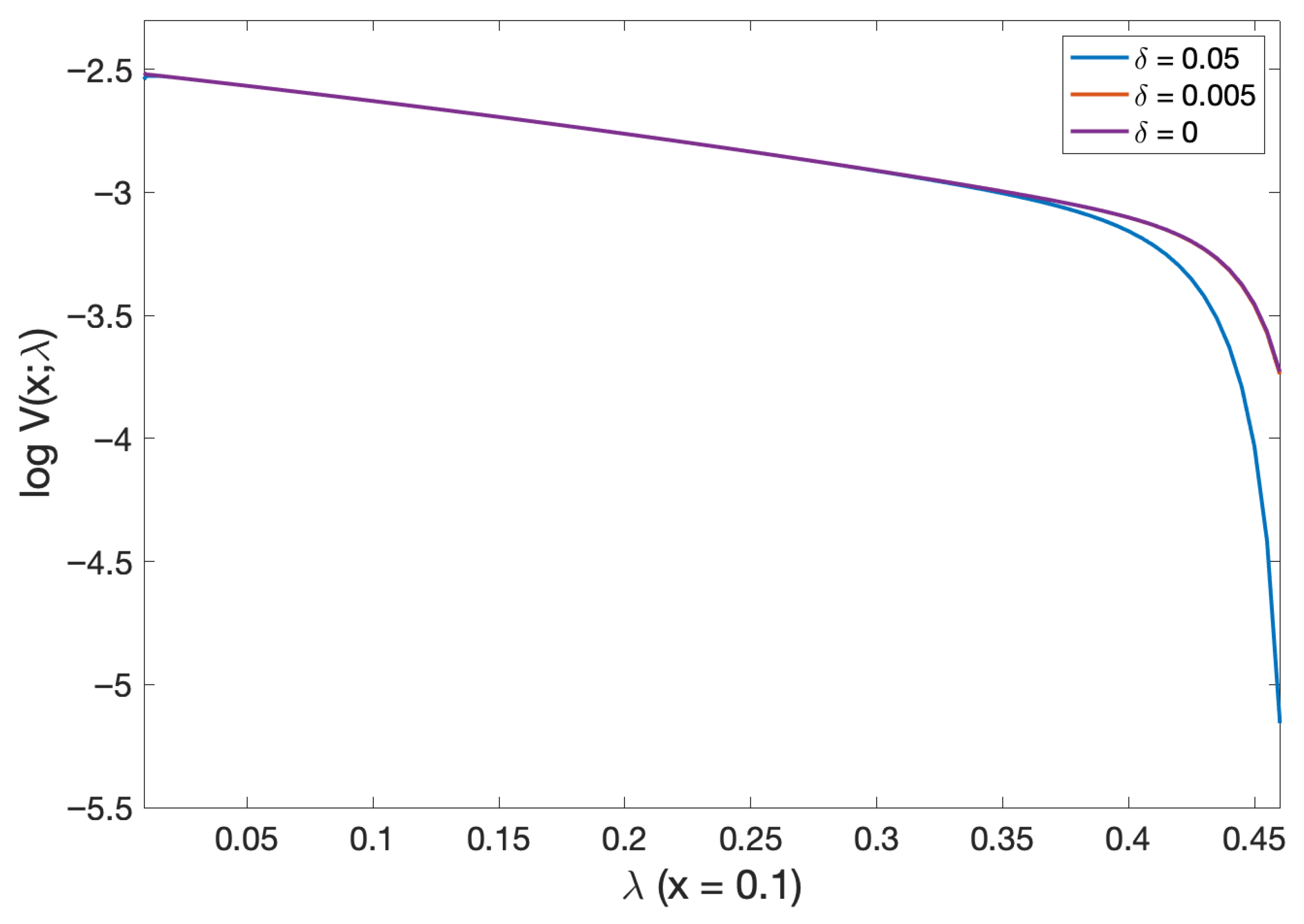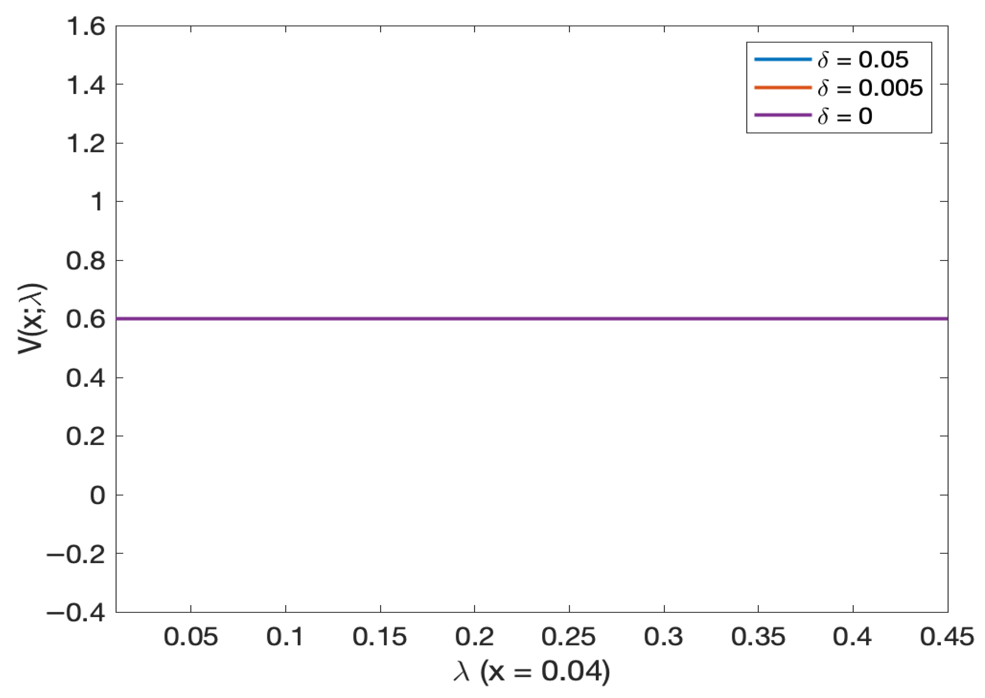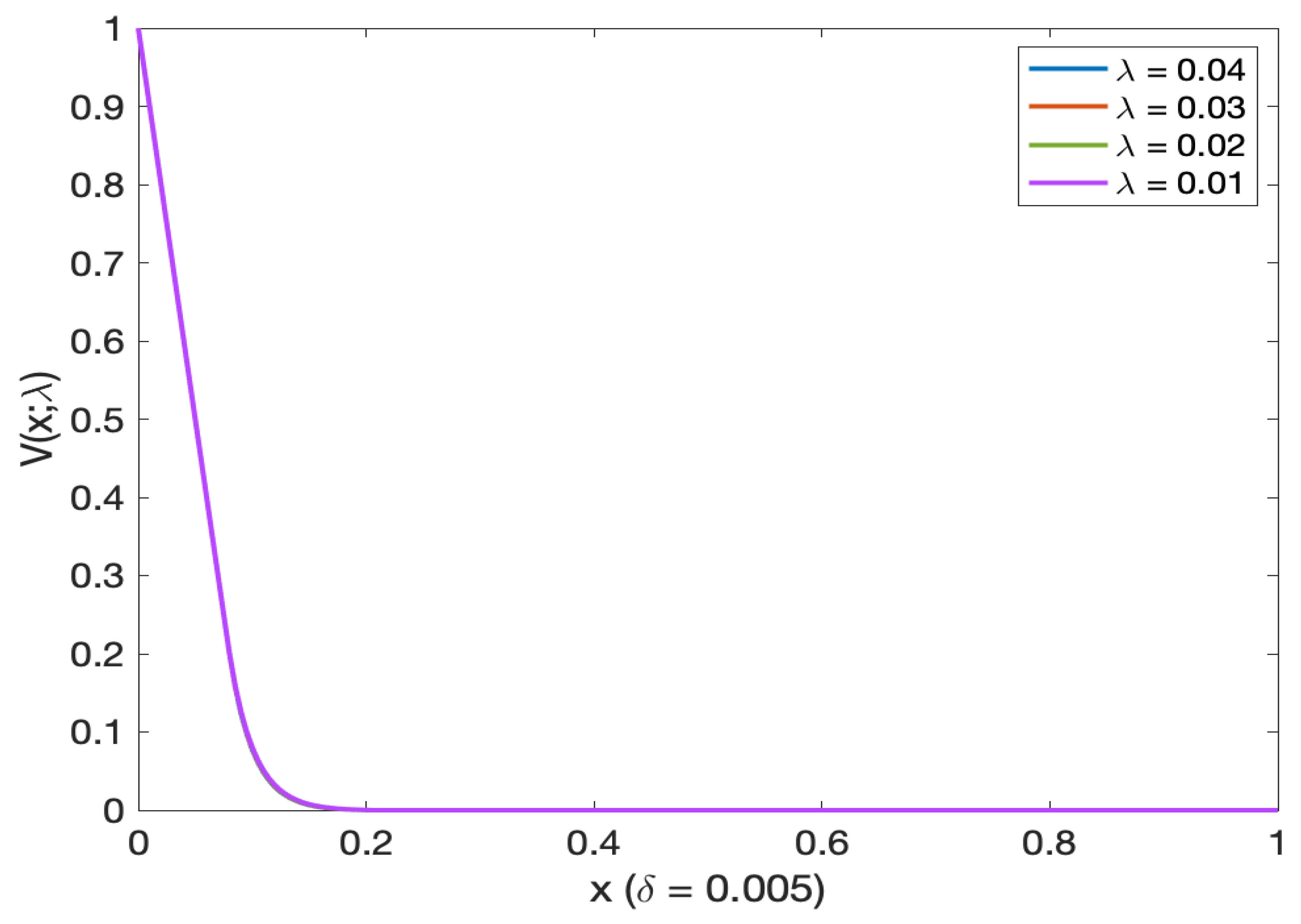 In our work, the value function represents the probability that a life insurance company with initial wealth x and current mortality intensity defaults (ruins) before the random termination time . In actuarial terms, thus links an insurer’s capital position to its probability of default. It therefore provides the key ingredient needed to determine risk-based reserves, i.e., the level of assets required to guarantee that the company remains solvent with a prescribed probability.