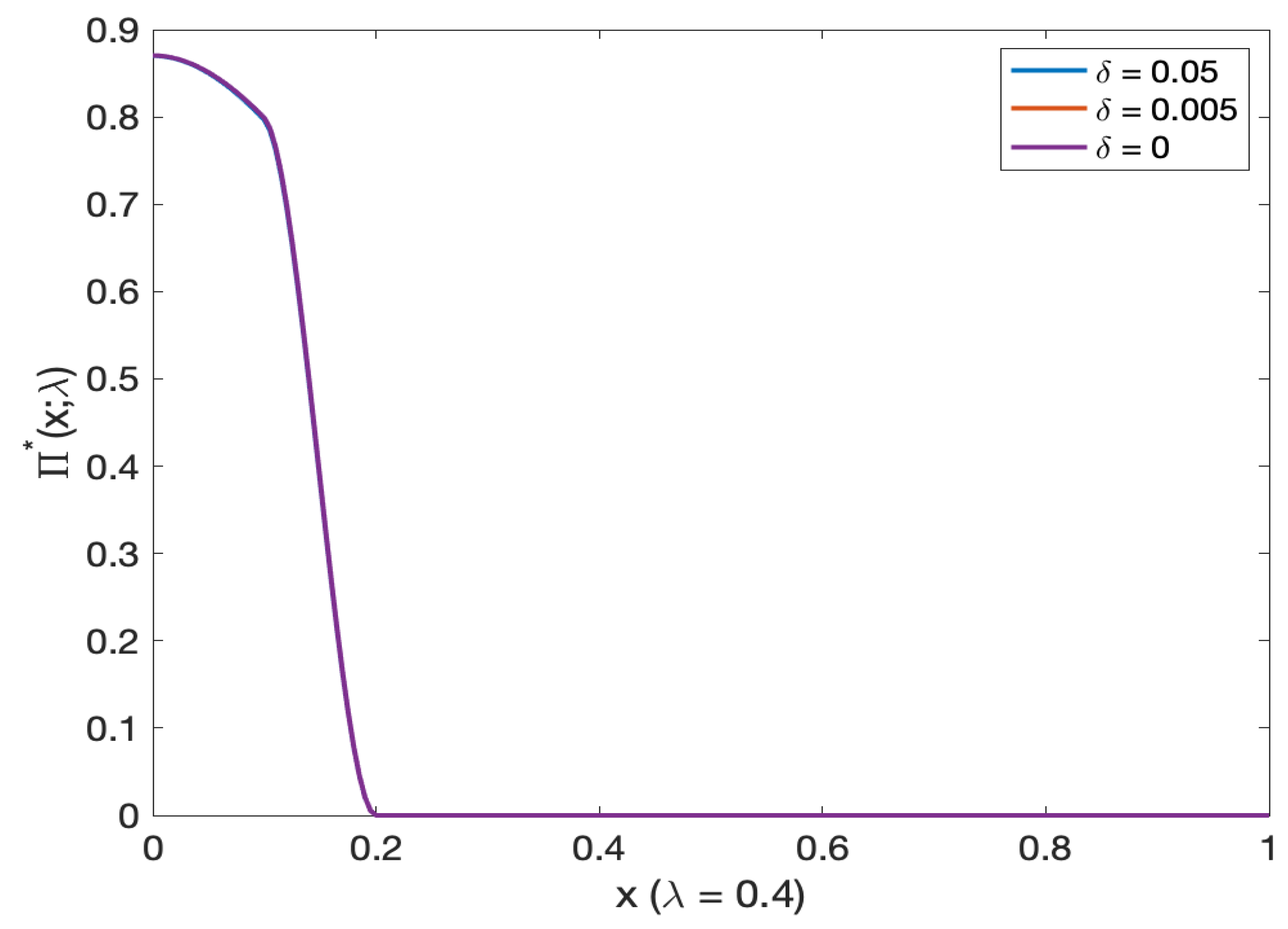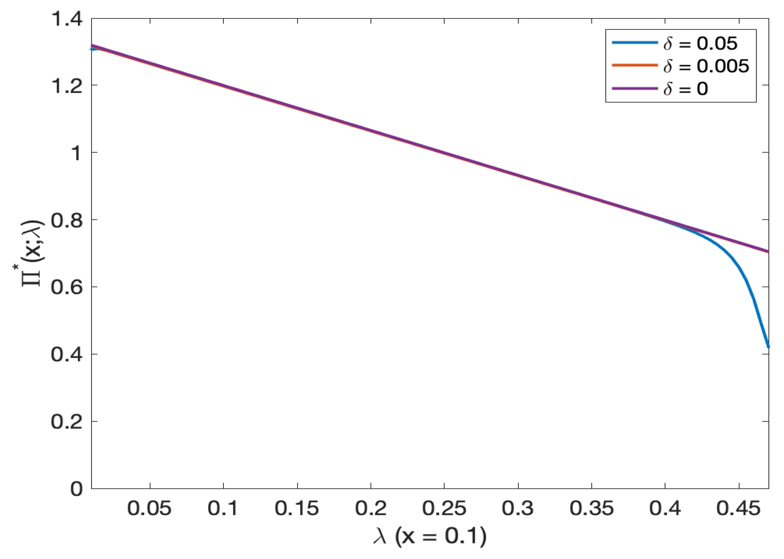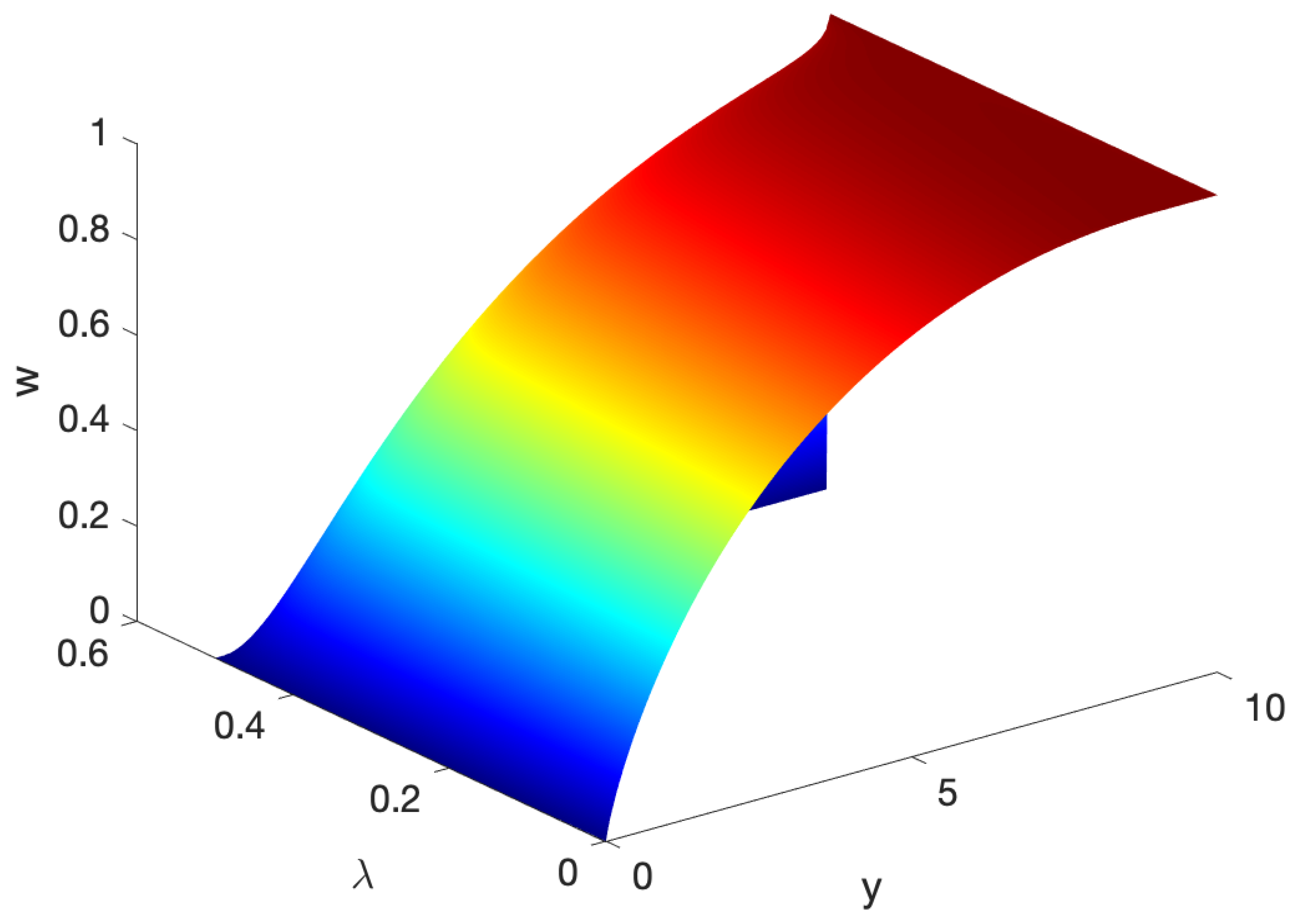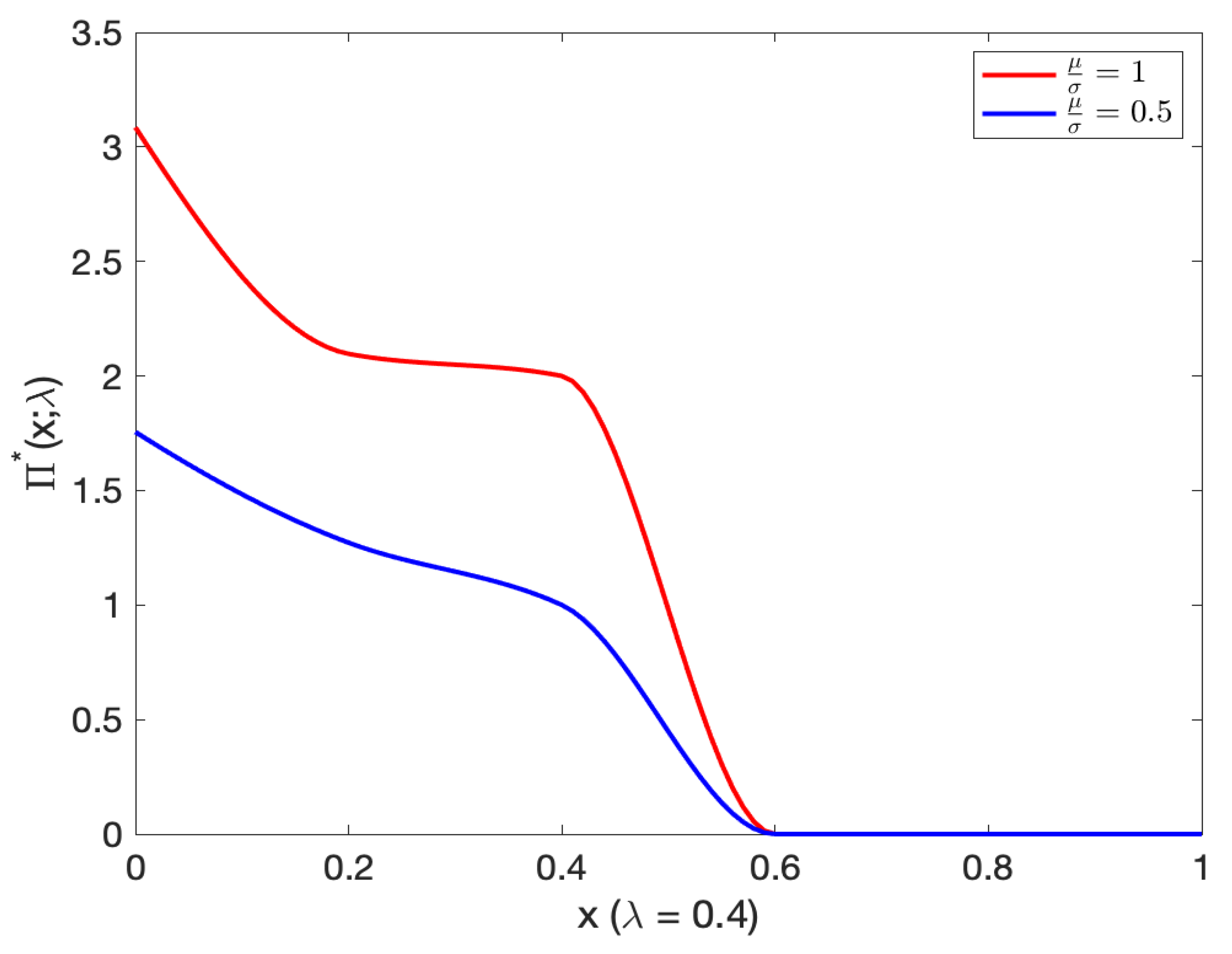 In our work, the value function represents the probability that a life insurance company with initial wealth x and current mortality intensity defaults (ruins) before the random termination time . In actuarial terms, thus links an insurer’s capital position to its probability of default. It therefore provides the key ingredient needed to determine risk-based reserves, i.e., the level of assets required to guarantee that the company remains solvent with a prescribed probability.