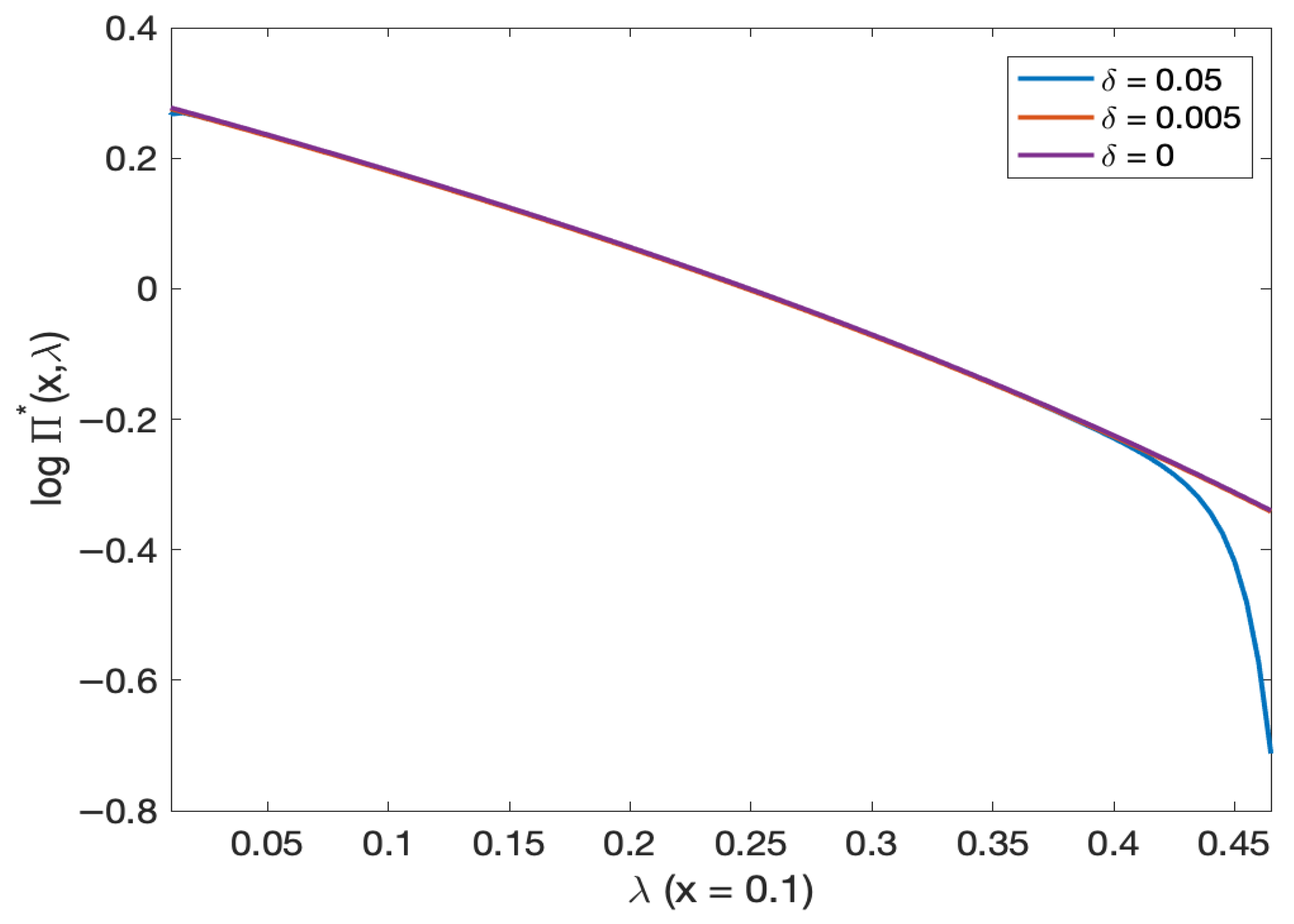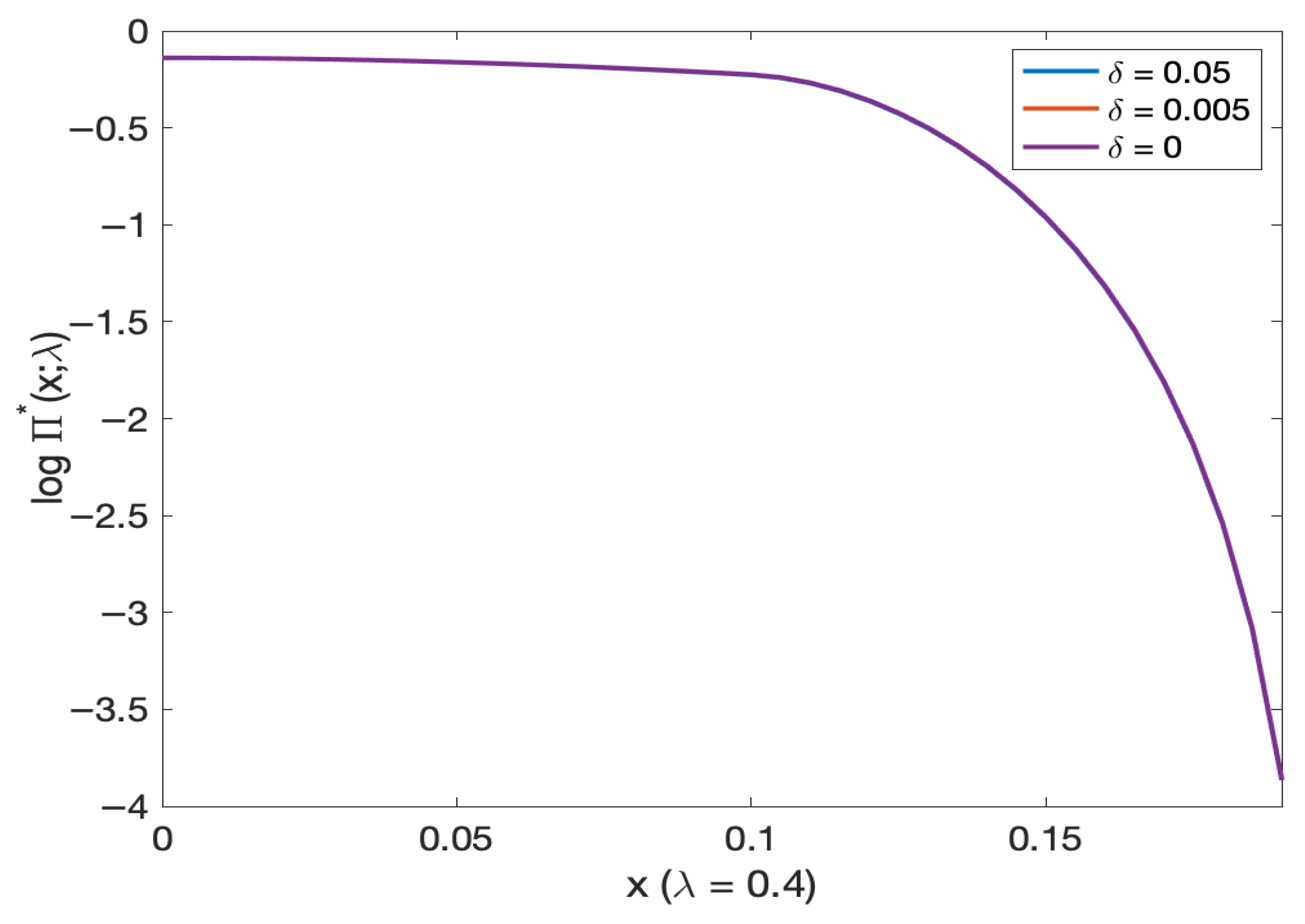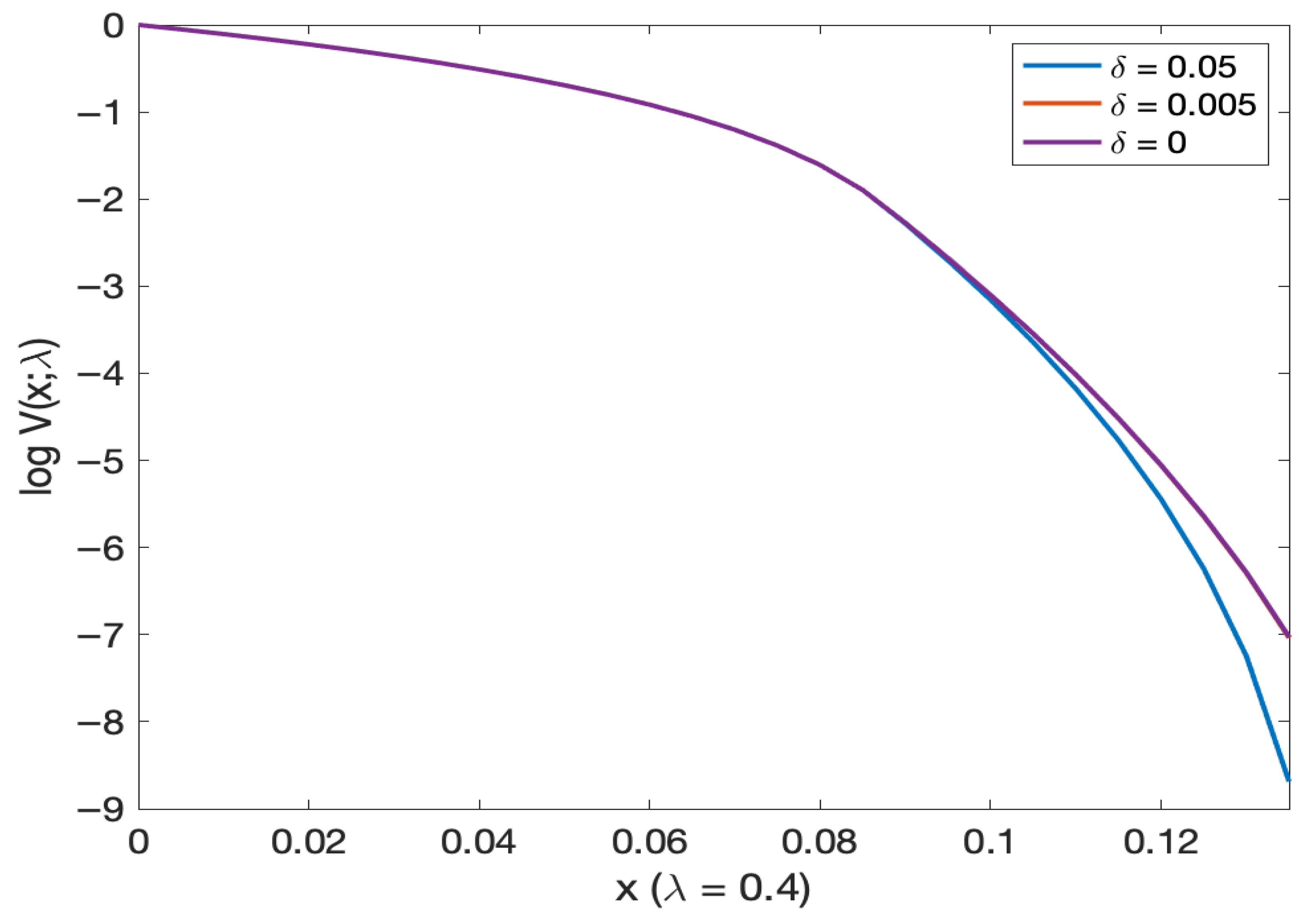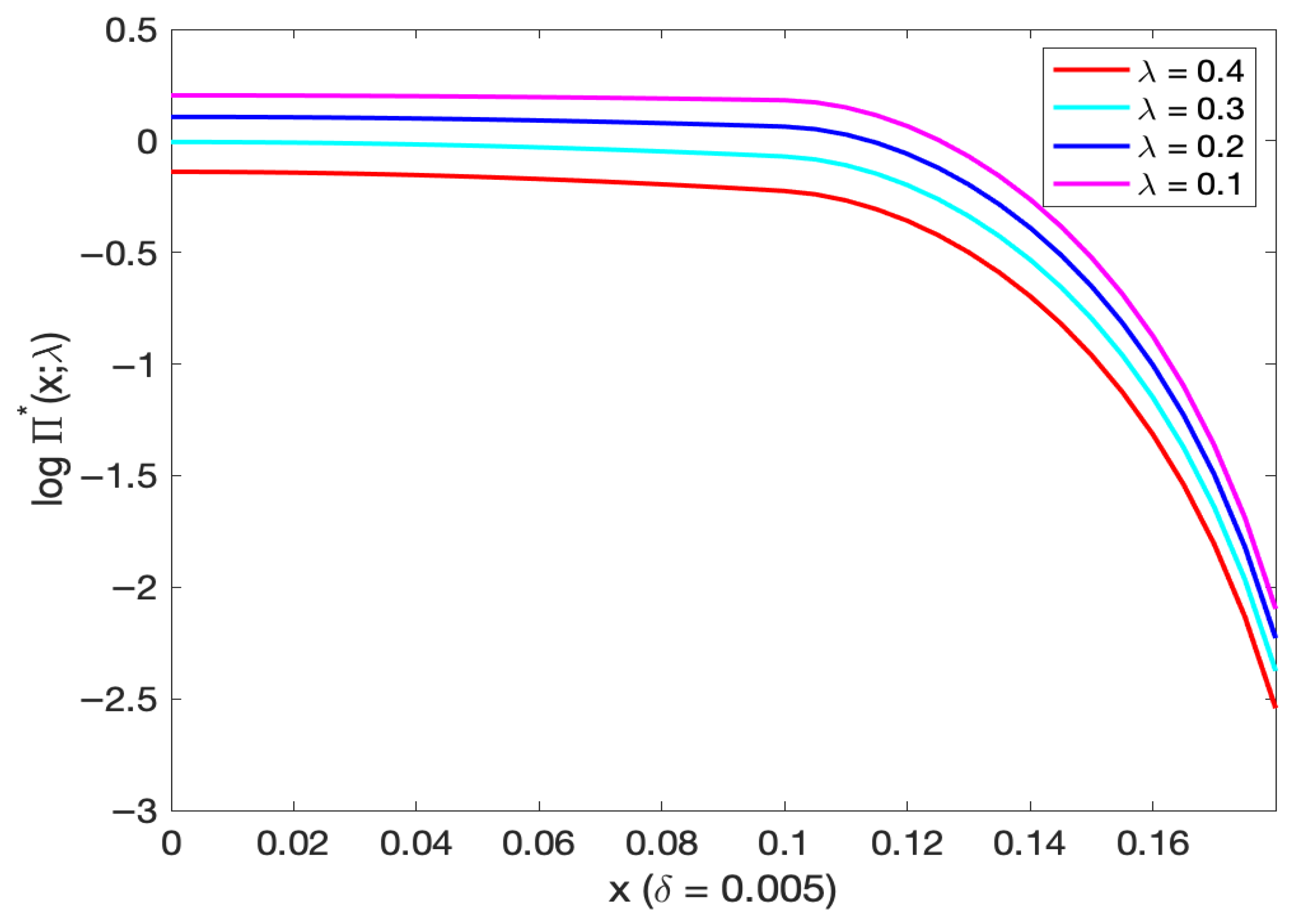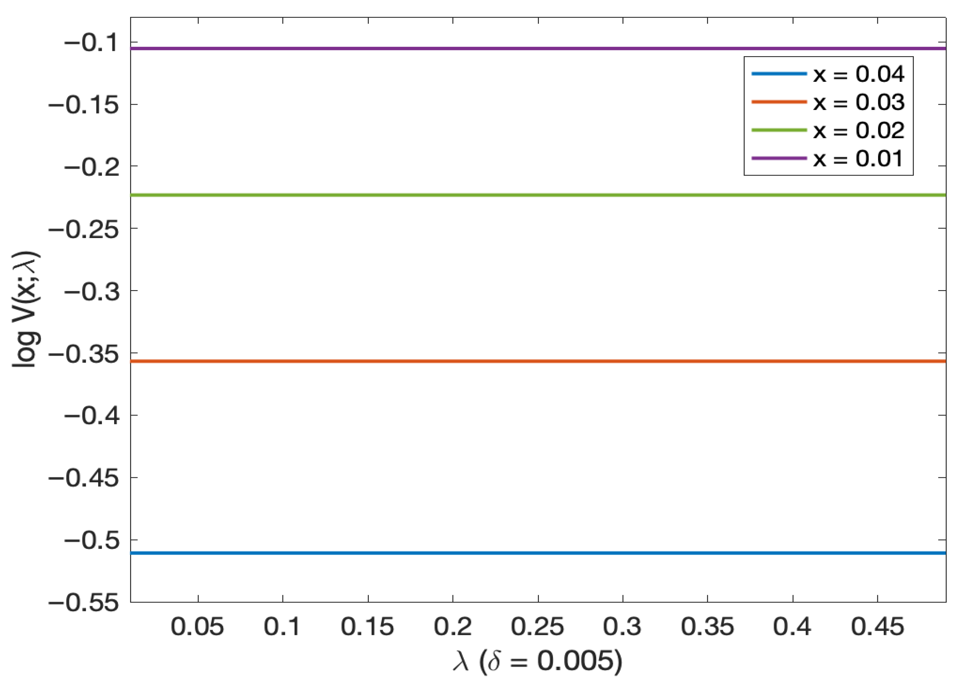 Figure 6) illustrated the probability of default (and, respectively, log probability of default in Figures as a function of initial wealth for different mortality intensity levels). We see that the probability of default decreases as we increase the initial wealth (this is true for all different initial mortality intensities). This probability approaches 0 as the initial wealth exceeds 0.15. From