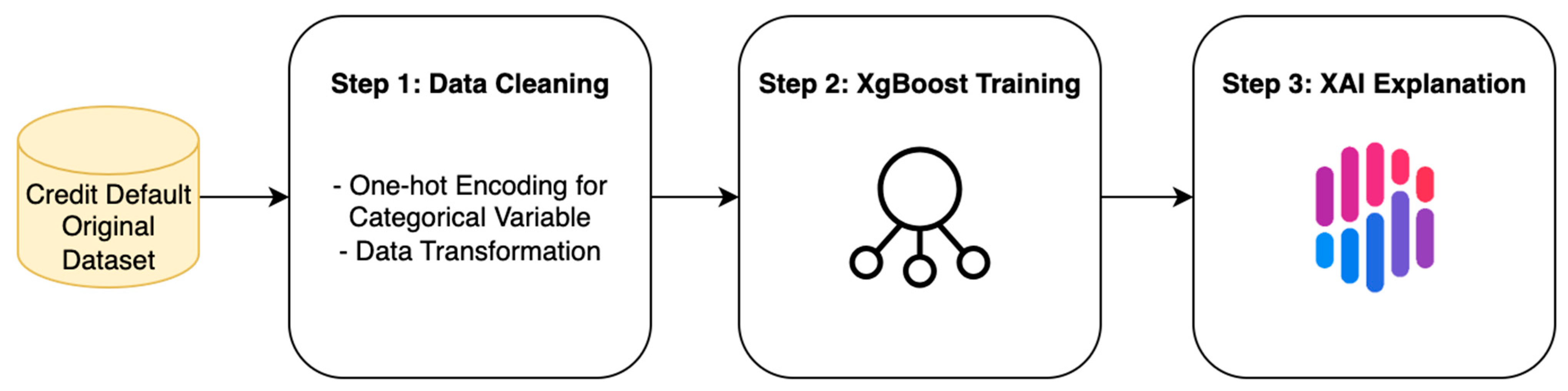 Step 1 Data Source and Cleaning: We employ the Default of Credit Card Clients dataset from the Machine Learning Repository of University of California, Irvine (UCI), which contains 30,000 credit card accounts in Taiwan (Yeh 2009). The data are cleaned and pre-processed through exploratory analysis, variable selection, and variable transformation to ensure feature quality.