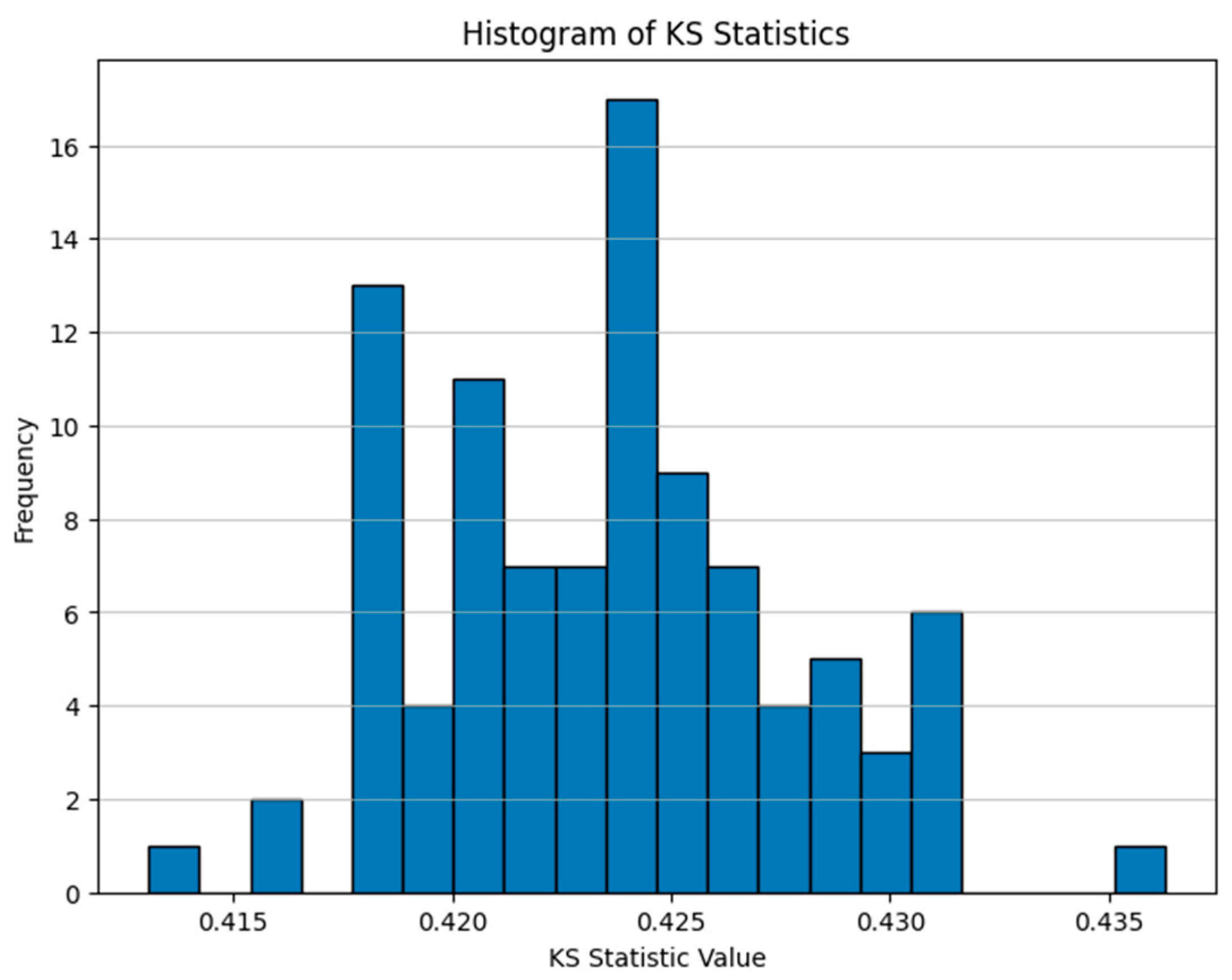The Kolmogorov–Smirnov (KS) values across the 100 independently trained XGBoost models demonstrate strong and consistent discriminatory performance. As shown in Figure 2, KS values range from 41.31% to 43.63%, with a median of 42.37%. The narrow range indicates that different random seed initializations have minimal impact on model discrimination ability, confirming that all models exhibit comparable predictive strength.